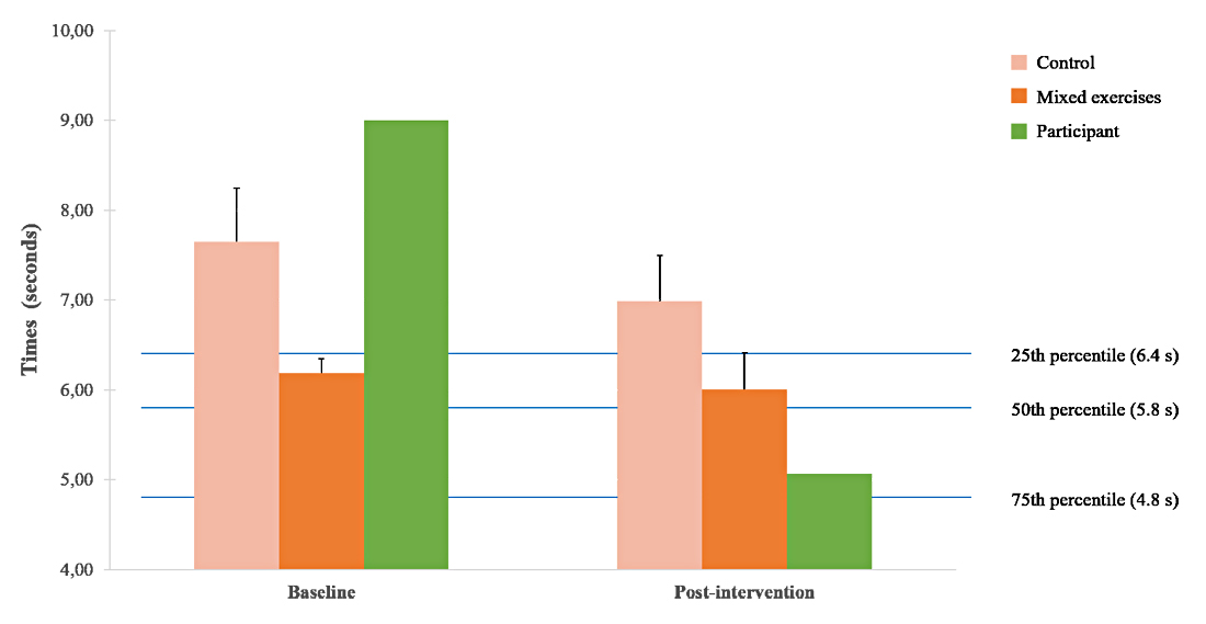 Figure 1. Pre-post intervention difference for dynamic balance (8FUG). Group results are presented as mean ± standard error of the mean. The 25th, 50th, and 75th percentiles represented are the values proposed by Rikli & Jones (1999) [14] for 65 to 69-year-old women.