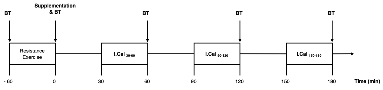 Prior to each condition, participants were asked to avoid exercise or strenuous physical activity for 48 h. For each condition, all measures were performed in the same manner as depicted in the Figure 1. During the 180 min post-exercise period, energy expenditure and lipid oxidation (determined by indirect calorimetry; I.Cal) were measured and blood samples were collected to estimate systemic fat mobilization (plasma glycerol [19,20]) and measure free fatty acids (FFA), glucose and insulin levels. Three measures of energy expenditure and lipid oxidation were performed: (1) between 30–60 min after resistance exercise (I.Cal30–60); (2) between 90–120 min (I.Cal90–120); (3) between 150–180 min (I.Cal150–180). Five blood samples were collected to measure glycerol, FFA, glucose, and insulin plasma levels: (1) Before resistance exercise (T−60); (2) immediately after the end of resistance exercise + post-exercise supplement (T0); (3) 60 min post-exercise (T60); (4) 120 min post-exercise (T120) and (5) 180 min post-exercise (T180).