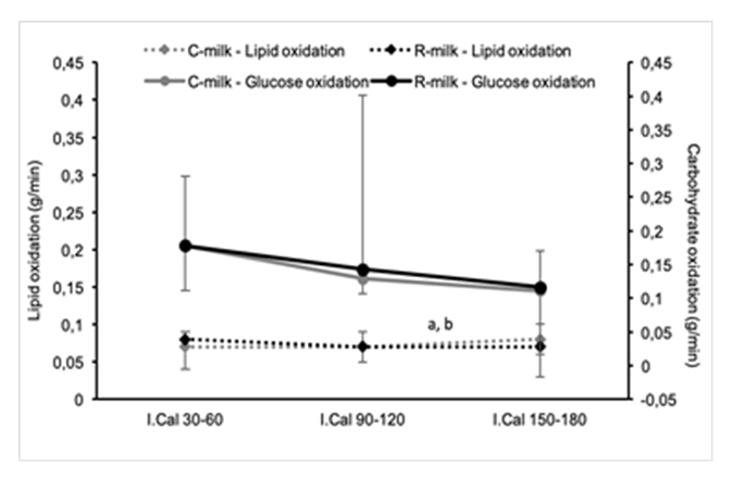 As shown in Figure 2, lipid oxidation demonstrated no significant changes in the first hour after resistance exercise. However, from I.Cal90–120 to I.Cal120–180, lipid oxidation increased significantly in both conditions (R-milk: p = 0.03 and C-milk: p = 0.05).
