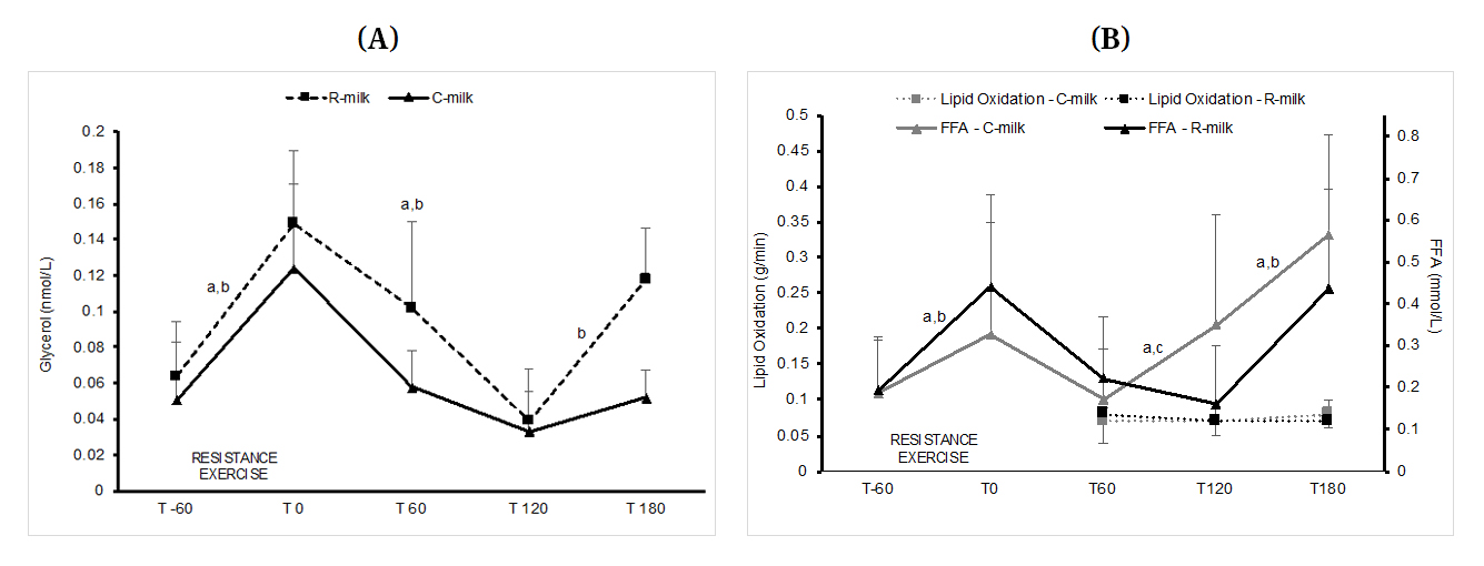 Conclusions: These results do not support a large impact of cow’s milk supplementation after resistance exercise on lipid oxidation and systemic fat mobilization. However, the greater increase in FFA levels suggests that re-esterification may be influenced.