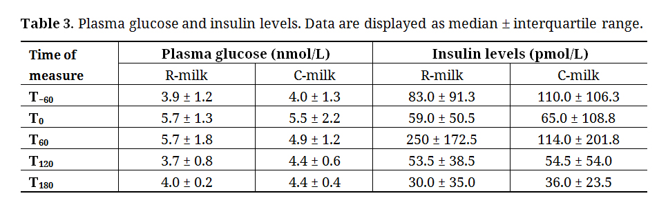 Insulin levels increased significantly during the first hour (from T0 to T60; p = 0.02) and decreased between T60 to T120 (p = 0.02) in R-milk. A similar pattern was observed in C-milk condition without reaching a statistically significant threshold (from T0 to T60: p = 0.12). However, a significant decrease in insulin levels was observed from T60 to T180 in C-milk (from T60 to T120: p = 0.03 and from T120 to T180: p = 0.02).