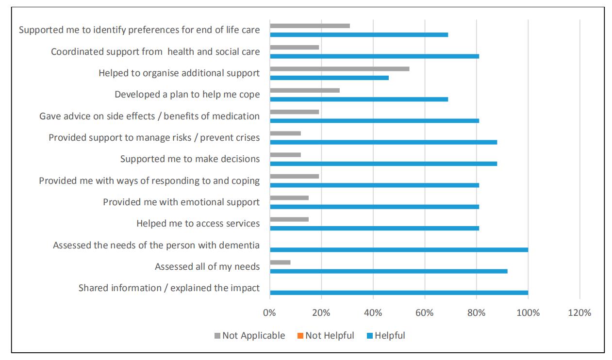 Supportive interventions were also clearly identified (Figure 3). Overall the Admiral Nurse was deemed by respondents to provide support that was person centred, with the four most helpful skill areas identified as knowledge and information; holistic assessment; supporting carers with decision making, and helping to anticipate prevent and avert crisis. Explicit interventions or skills of the Admiral Nurse included spending time and not rushing; listening; responding to questions; and showing compassion, respect and understanding (see Figure 3).