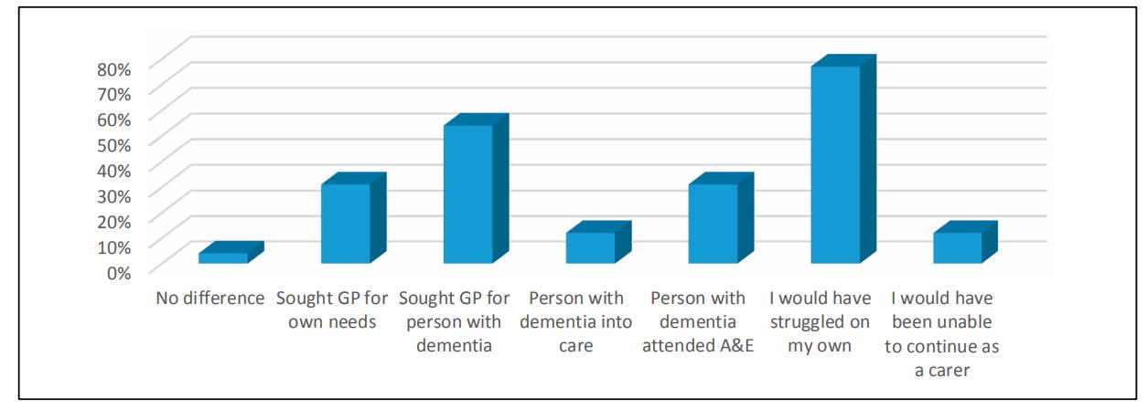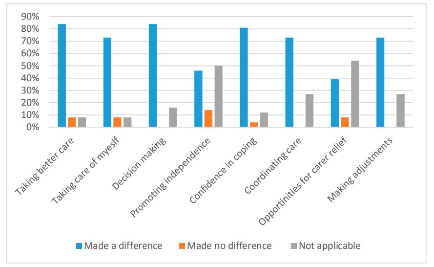 The nature (see Figure 4) and impact of the Admiral Nurse was expectedly variable, since individual needs vary so much as do expectations, but the biggest impact was around the carers’ ability to make decisions; to take better care of their loved ones; increased confidence in coping; and self-care (looking after themselves) (see Figure 5).