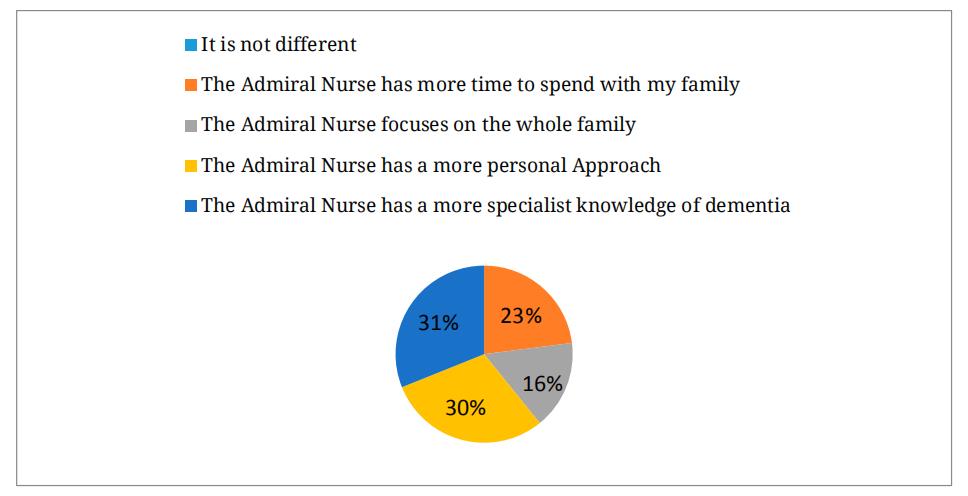 The literature well recognises the pressure on carers, and in this evaluation, one respondent recognised their helplessness and desperation around having access to an Admiral Nurse, reflecting: “Without her help, I may well have sunk into depression as a carer…” Knowledge, skills and professional experience were valued and welcomed by respondents as explicit skills of the Admiral Nurse.
