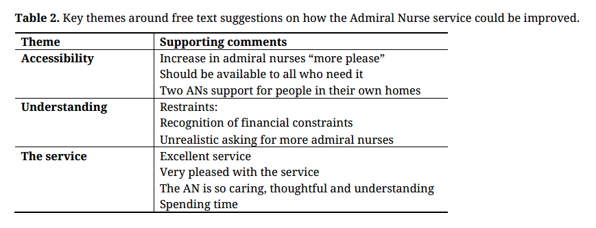 Table 2. Key themes around free text suggestions on how the Admiral Nurse service could be improved.