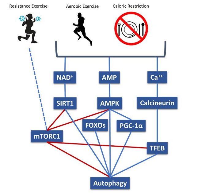 Figure 1. Exercise and caloric restriction activate autophagy through shared pathways. Solid blue lines represent positive regulation. Solid red lines represent negative regulation. Dotted blue line represents positive regulation, but unknown downstream mTORC1-mediated effects on autophagy in response to resistance training. NAD+: nicotinamide adenine dinucleotide; AMP: adenosine monophosphate; Ca++: calcium; SIRT1: NAD-dependent deacetylase sirtuin-1; AMPK: adenosine monophosphate kinase; FOXOs: forkhead box transcription factors; PGC-1α: Peroxisome proliferator-activated receptor gamma coactivator 1-alpha; mTORC1: mammalian target of rapamycin; TFEB: transcription factor EB.