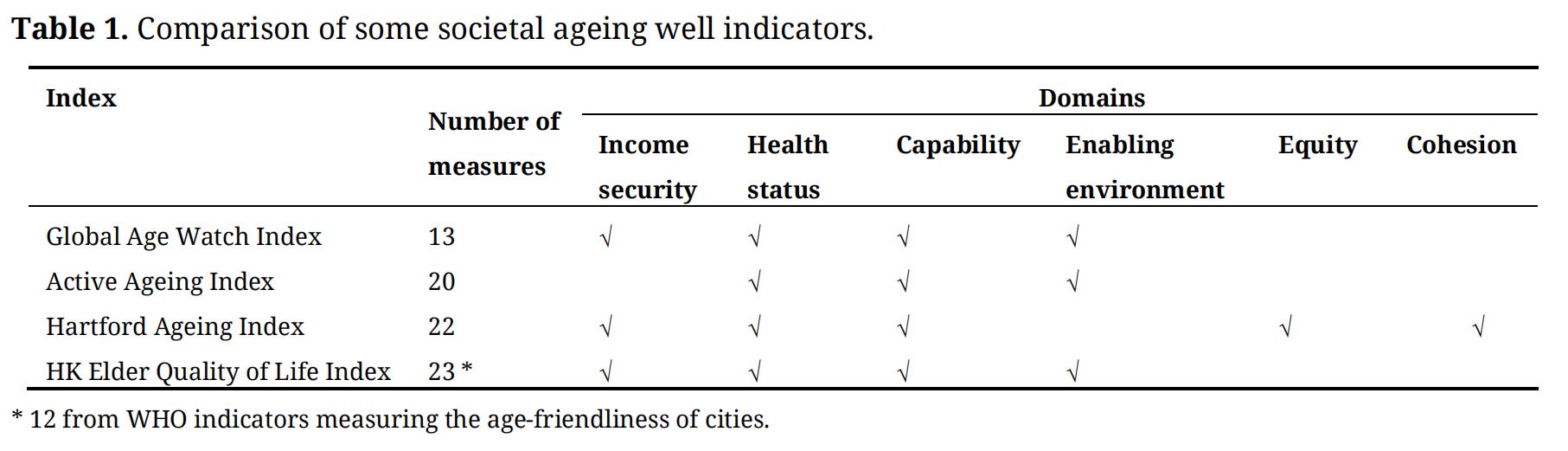 A universal aim for ageing societies is that older people may remain healthy, be functionally independent, and be engaged in society. Various indicators with summary scores have been proposed, which may be used for international comparison or within country monitoring to guide ageing policy development and evaluate effectiveness of such policies. However, it is uncertain whether these indicators may be adapted to countries with different cultures and political systems. Simple indicators such as the Human Development Index may be misleading when compared to more detailed multi domain indices in reflecting the performance of ageing policies in a particular country, such as the Hong Kong Elder Quality of Life Index (EQOLHK). Construction of country specific indicators may be more relevant to shaping ageing policies rather than using indicators just for the sake of international ranking.
