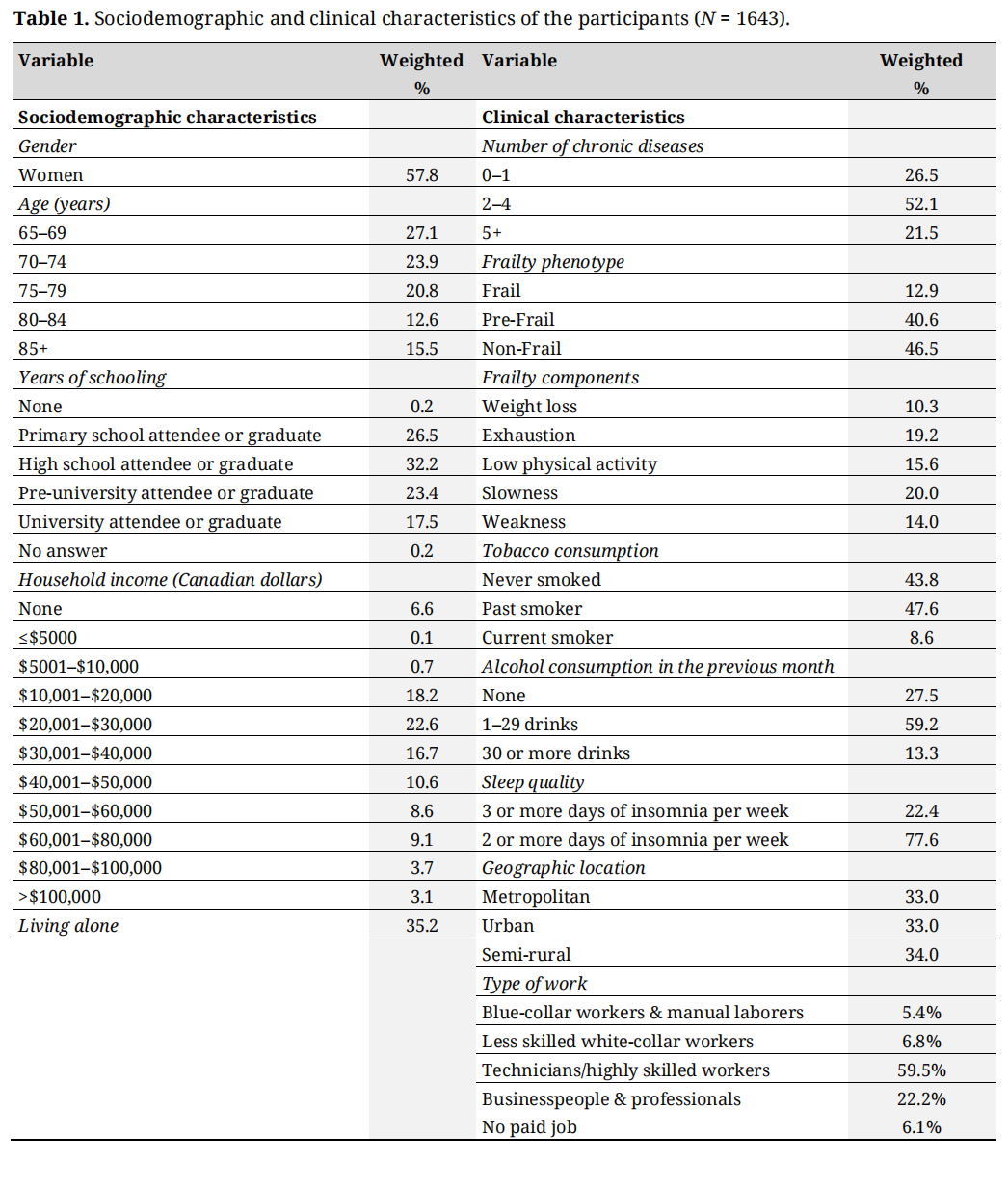 Table 1 presents the main participants’ baseline characteristics. Frequencies were weighted to apply the results to the general population from which the participants were drawn. The proportion of women (57.8%) was slightly higher than that for men. The participants’ mean age was 75.4 years (SEM = 0.08) and more than one third reported living alone (35.2%). A majority (73.3%) of participants had completed a high school education degree (≥13 school years) and about one quarter (25.6%) reported a yearly income of $20,000 or less. Over half (52.1%) the participants reported 2 to 4 comorbidities. Based on the descriptive data, slowness was the most prevalent frailty component (20.0%), closely followed by exhaustion (19.2%). Almost half (47.6%) the participants were past smokers and a majority (59.2%) were moderate alcohol drinkers. Among drinkers, a large proportion reported consuming wine (64.8%) and, to a lesser extent, beer (43.3%) and hard liquor (24.8%); about a quarter of the sample (24.5%) started drinking before the age of 18. Nearly one quarter (22.4%) reported poor sleep. The majority of participants had been technicians or highly skilled workers (59.5%).