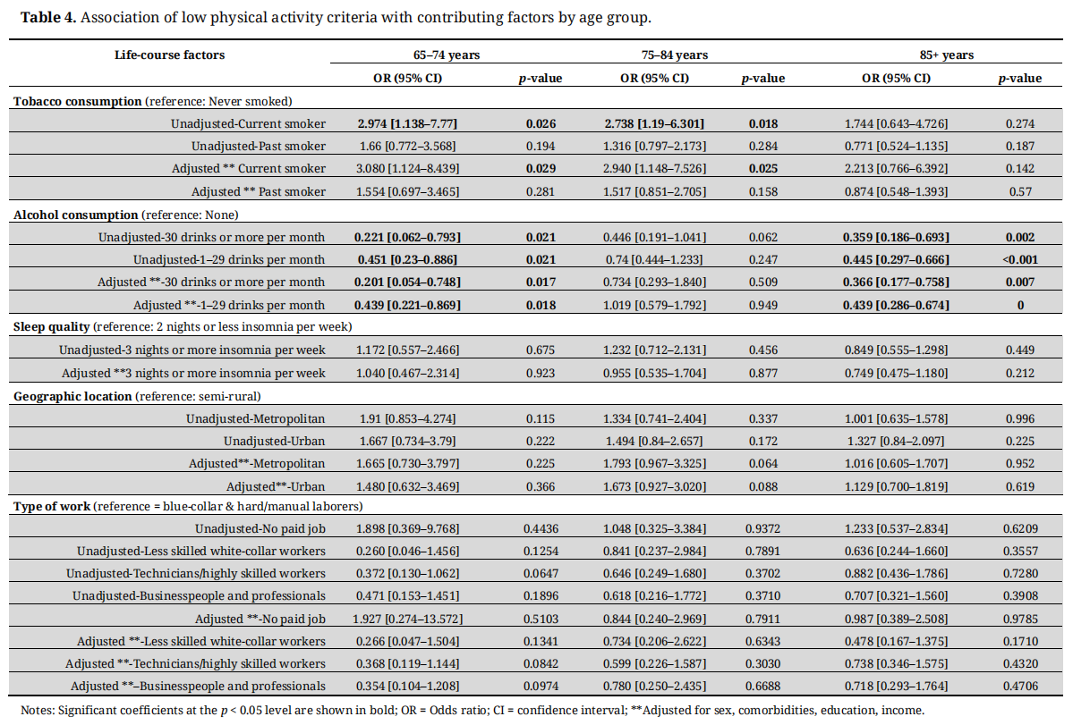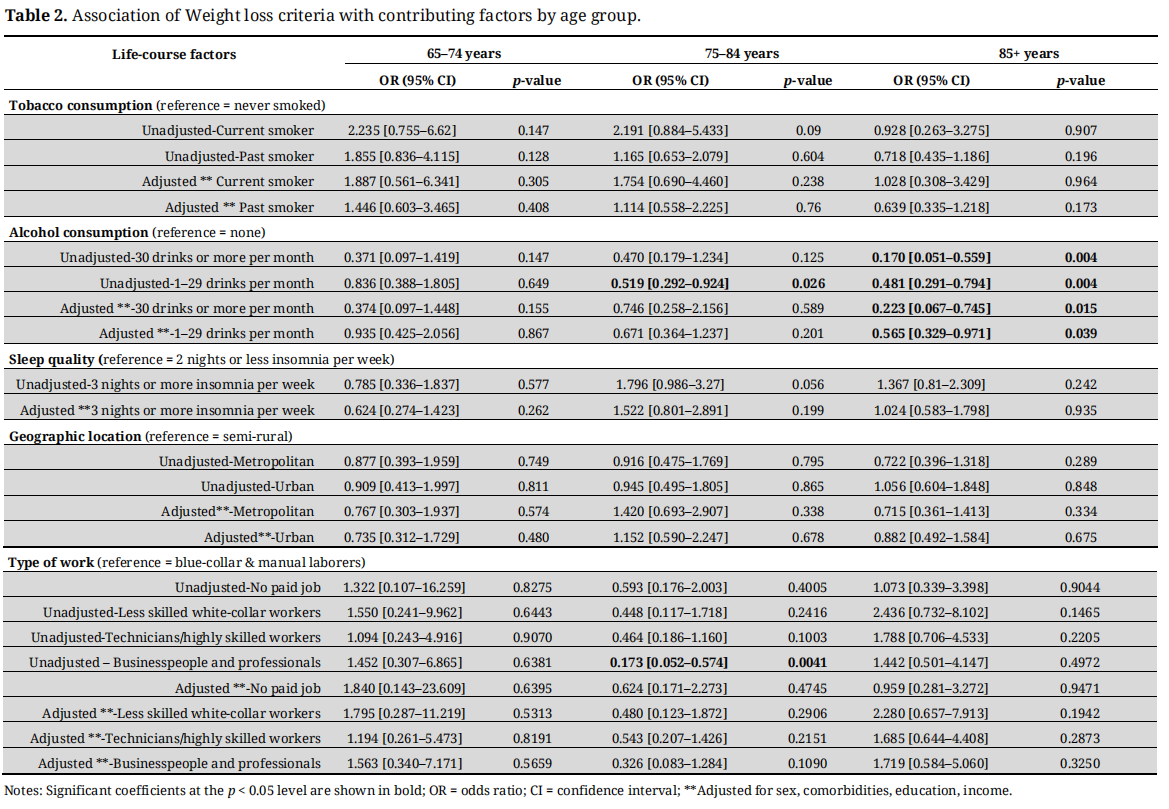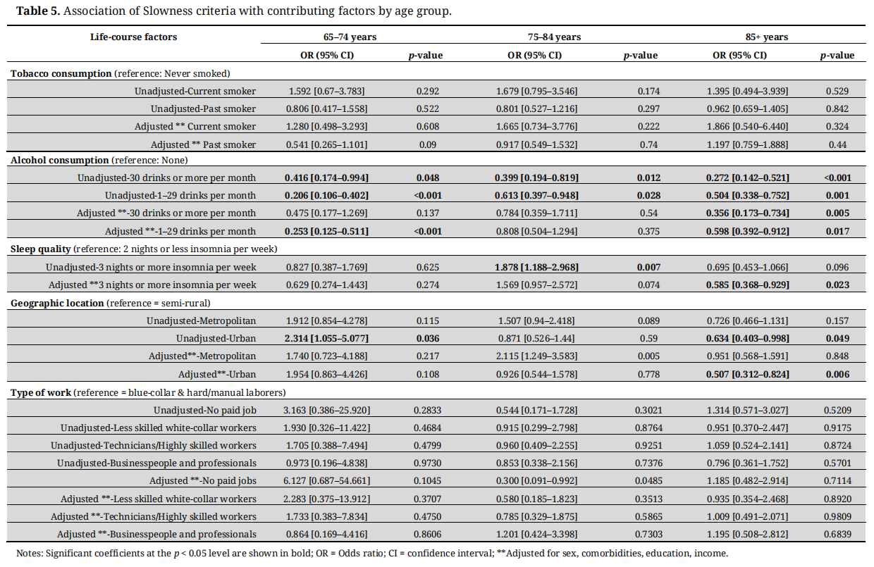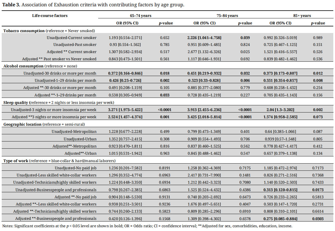 Concerning clinical implications, the present study highlights the potential relevance of: (1) helping the youngest-old to stop smoking and hopefully prevent or delay the early manifestation of frailty in this subgroup. Despite the challenges of giving up this habit in the context of lifelong dependence [46], the benefits of smoking cessation even at an older age (late 50 s/early 60 s) could be promoted through programs tailored to their specific needs; (2) investigating sleep quality when assessing frailty to potentially reduce exhaustion through appropriate interventions targeting physiological (apnea) or affective (depressive symptoms) factors. As the relationship between sleep disorders and exhaustion can be two-way [47,48], future studies should investigate whether poor sleep tends to be a cause of exhaustion in the youngest-old and a consequence of age-related fatigue in the oldest-old, which may suggest different treatments according to age; and (3) questioning whether the protective effect of moderate alcohol consumption, especially wine, is linked directly to alcohol, or whether it is a proxy measure of engagement in social activities [49]. This hypothesis is supported by recent data suggesting that social participation may reduce the risk of slowness in older adults [50], which is consistent with the significant relationship found in our study between this frailty component and moderate alcohol consumption.