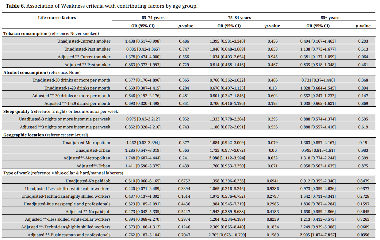 This study aimed to evaluate the contribution of (a) lifestyle habits (tobacco and alcohol consumption, quality of sleep), (b) geographic location (semi-rural, urban or metropolitan area), and (c) type of work to the manifestation of individual frailty components in community-dwelling youngest-old (65–74 years). More specifically, we explored, first, (1) which of these potential life-course factors increase the risk of exhibiting components of frailty at a younger age, after controlling for confounders; and second, (2) whether the contribution of these possible life-course risk factors decreases with advancing age.