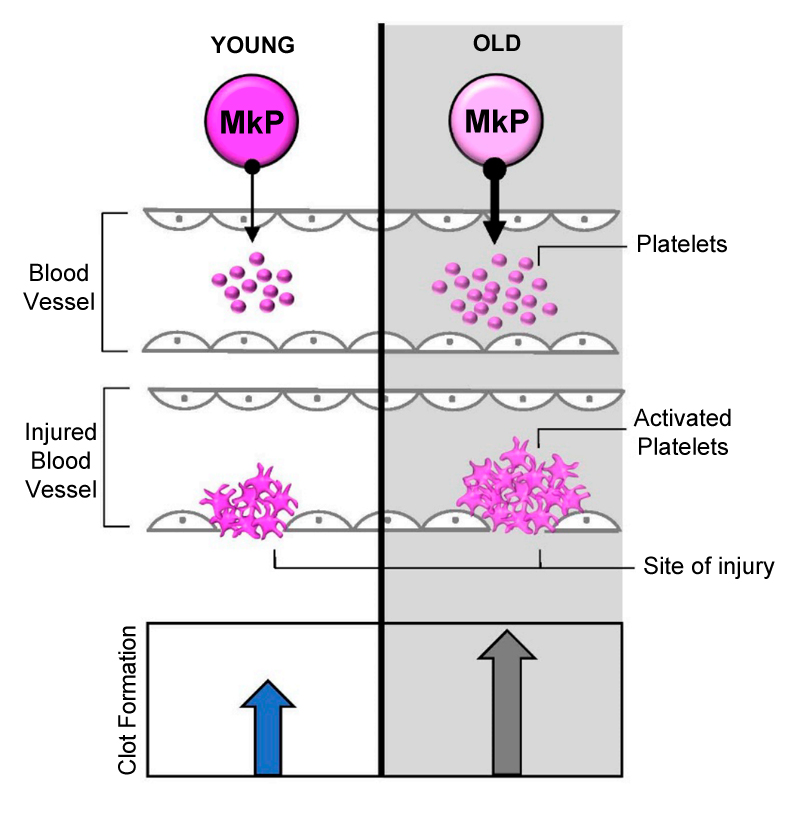 Figure 2. Age-related changes in platelets support prothrombotic state observed in the elderly. Platelets are derived via Megakaryocyte Progenitors (MkP). Upon vascular injury, platelets adhere to the exposed subendothelial matrix, become activated, and aggregate with nearby platelets to form a clot. Mice, and possibly humans, have increased Plt numbers upon aging; both species display Plt hyperreactivity. During aging, MkPs likely give rise to deleterious platelets with functional defects, the culprits of potentially occlusive clots observed in thrombotic disorders that plague the elderly.