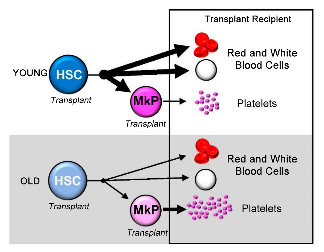 Figure 3. Hematopoietic stem and progenitor cell origins of platelets are altered during aging. Transplantation experiments revealed that old Hematopoietic Stem Cells (HSCs) exhibited a decline in generation of all hematopoietic lineages, including Megakaryocyte Progenitors (MkPs) and platelets. However, old MkPs exhibited a remarkably greater expansion capacity upon aging, giving rise to significantly greater numbers of platelets compared to young MkPs.