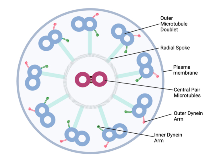 Aging leads to an increased frequency of ultrastructural changes in the cilia. A normal cilium has a cross-sectional ultrastructure containing two central microtubules and nine peripheral microtubule doublets (Figure 2). The ultrastructure of cilia can be analyzed using transmission electron microscopy (TEM). When TEMs from younger (11–39 years) and older donors (>40 years) were compared, 2.5% of older donors had the ultrastructural change of a single tubule, instead of the doublet tubules shown in Figure 2, vs 0.8% in younger donors [17]. These acquired ultrastructural changes can potentially alter ciliary function [27]. However, in this study, the ultrastructural changes did not correlate with ciliary beat frequency [17].