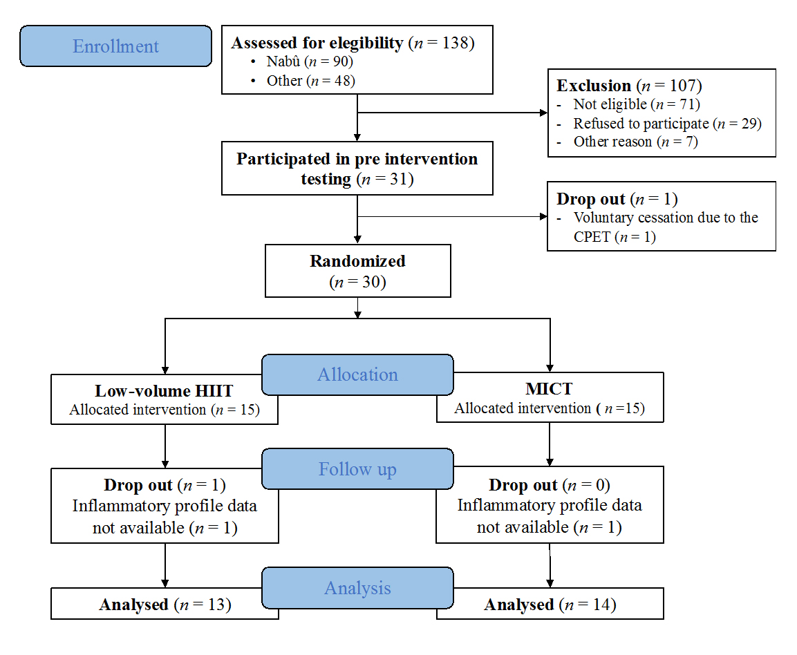 Figure 1. The CONSORT flow chart (from screening to the study analyses). CPET= cardiopulmonary exercise testing; HIIT= high-intensity interval training; MICT= moderate intensity continuous training.