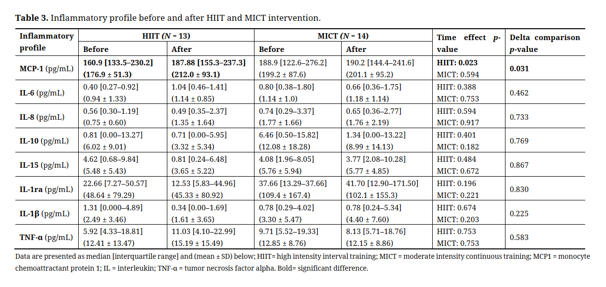 Table 3. Inflammatory profile before and after HIIT and MICT intervention.