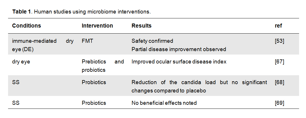Based upon our understanding of the role of dysbiosis in the onset and progression of autoimmunity, a provocative new strategy to intervene in diseases such as SS is to alter the gut microbiome to modulate the host immune response. Thus far, only a few studies have addressed microbiome interventions to modify the disease severity of SS (Table 1).