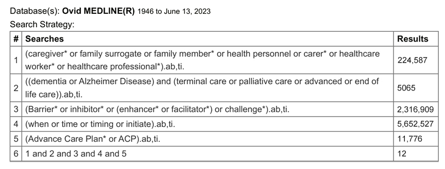 We searched MEDLINE (Ovid), PsycINFO, CINAHL Ultimate for peer-reviewed research articles on ACP with family surrogates of older adults with advanced dementia up to 13 June 2023. Search strategies include key word search for advance care planning, timing, dementia OR Alzheimer Disease, family surrogate OR member, healthcare worker OR professional, barrier OR facilitator. A sample database (MEDLINE) showing the search strategy and its results can be found in Figure 1.