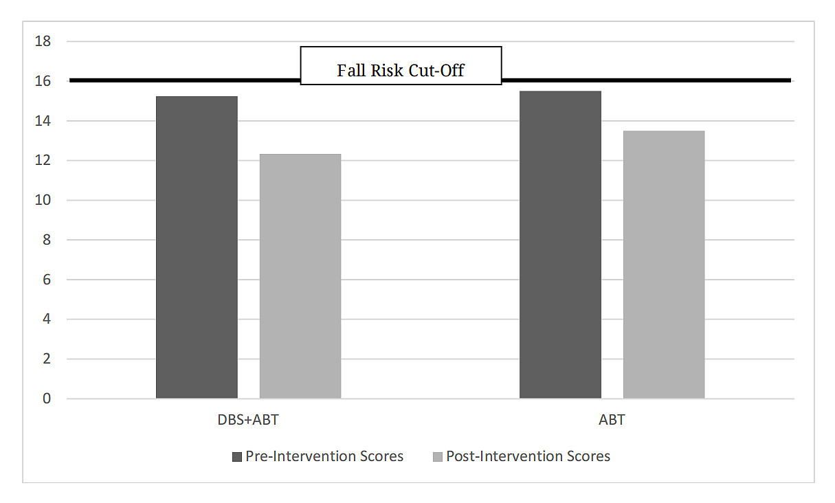 The results of the descriptive statistics showed that the DBS+ABT group had lower values for the ABC-6Scale percentage score difference before and after intervention (M = 14.8, SD = 19.36) than the ABT group (M = 15.93, SD = 16.56). The results of the descriptive statistics also showed that the post interventions ABC-6 Scale percentage scores for the DBS+ABT group (M = 60.65, SD = 20.32) and the ABT group (M = 59.93, SD = 23.53) were at the cut off score of 60% that distinguishes between fallers and non-fallers secondary to balance confidence (Figure 1) [20].