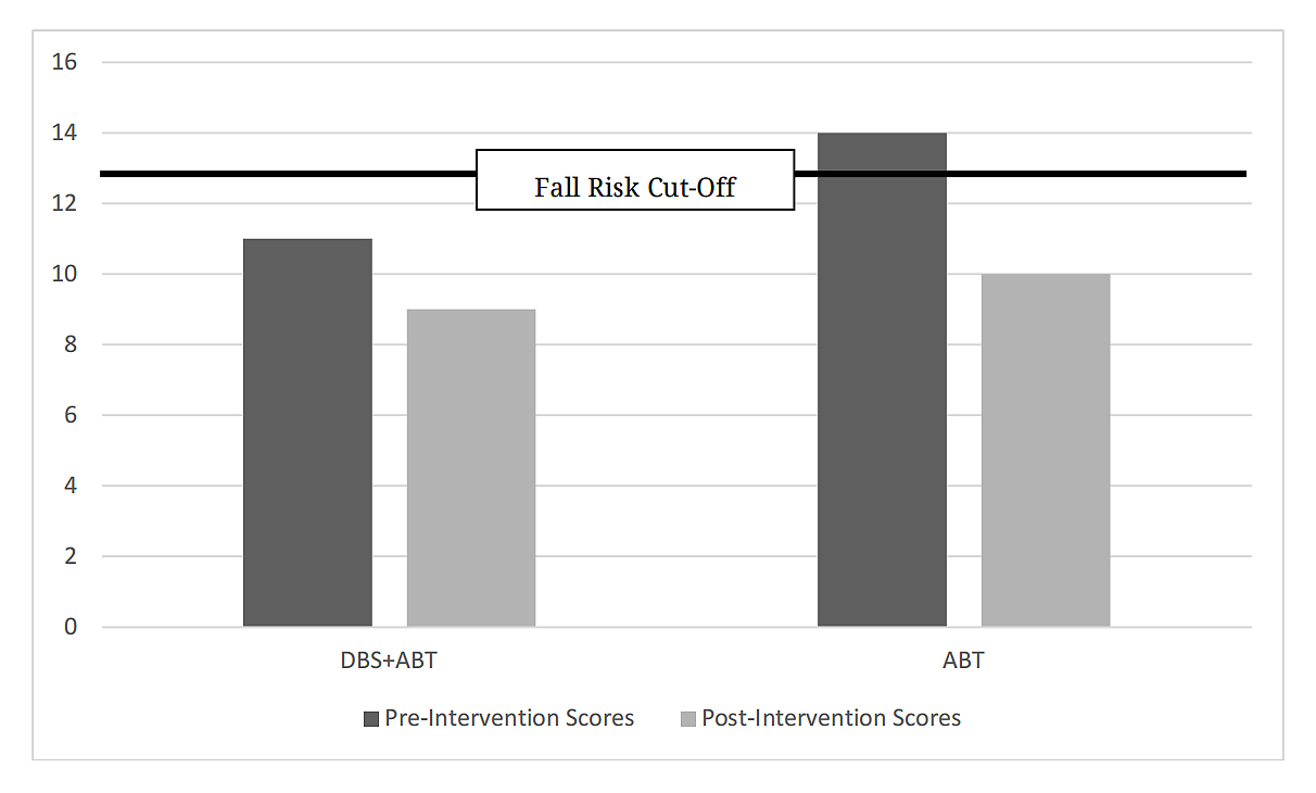 The results of the descriptive statistics showed that the DBS group had higher values for the FTSTS time difference before and after intervention (M = 3.12, SD = 4.43) than the ABT group (M = 1.71, SD = 4.54). The results of the descriptive statistics also showed that the post interventions FTSST time for the DBS+ABT group (M = 12.33, SD = 2.71) and the ABT group (M = 13.5, SD = 7.56) make the cut off score of 16.0 seconds to be classified as no longer a fall risk based on the lower extremity strength after the ABT intervention (Figure 2) [21].