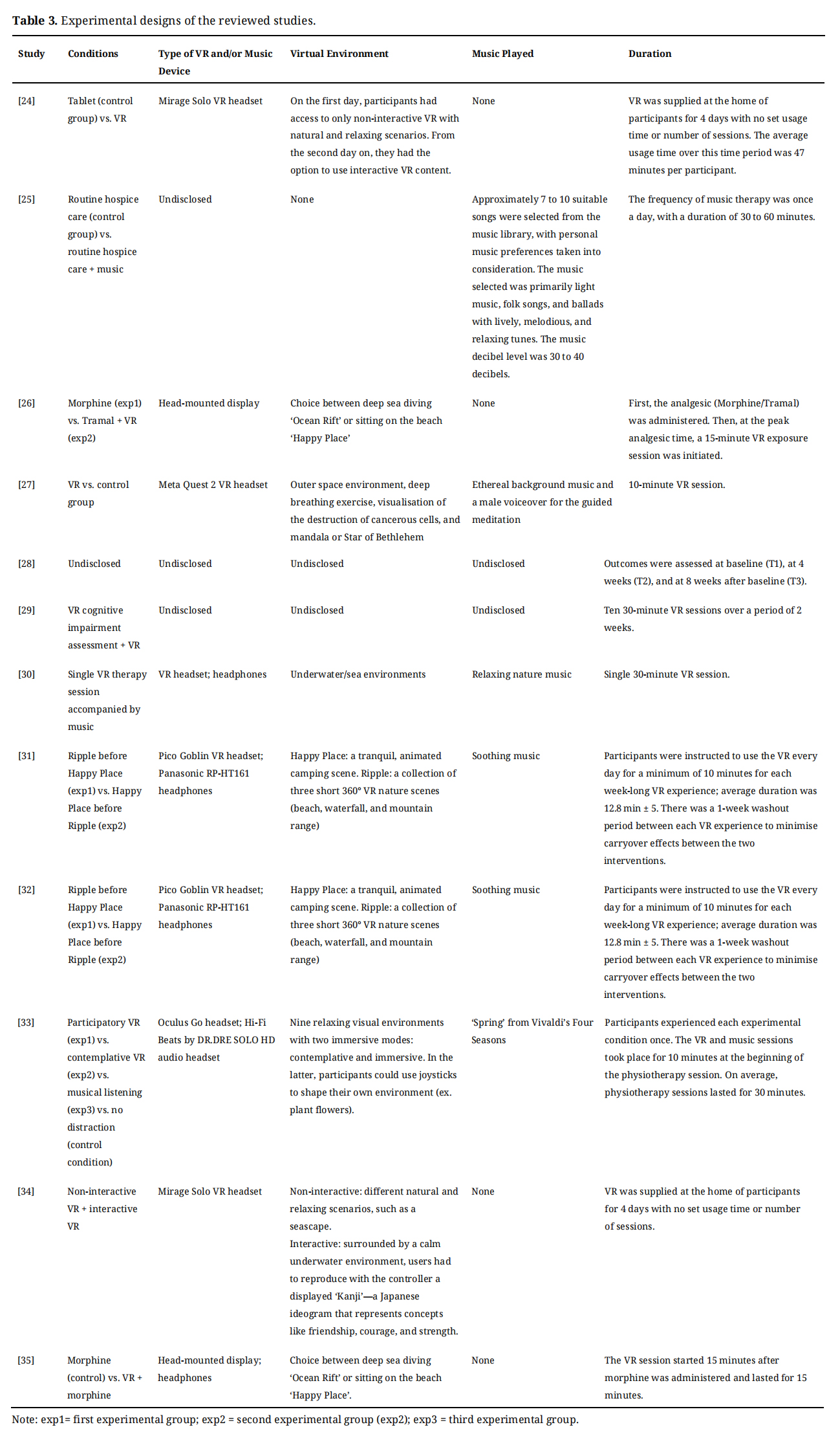 Four studies [27,30–32] combined VR and music in their interventions. Although none of these studies specifically aimed to evaluate the effects of music, they incorporated soothing/relaxing background music into the VR interventions.