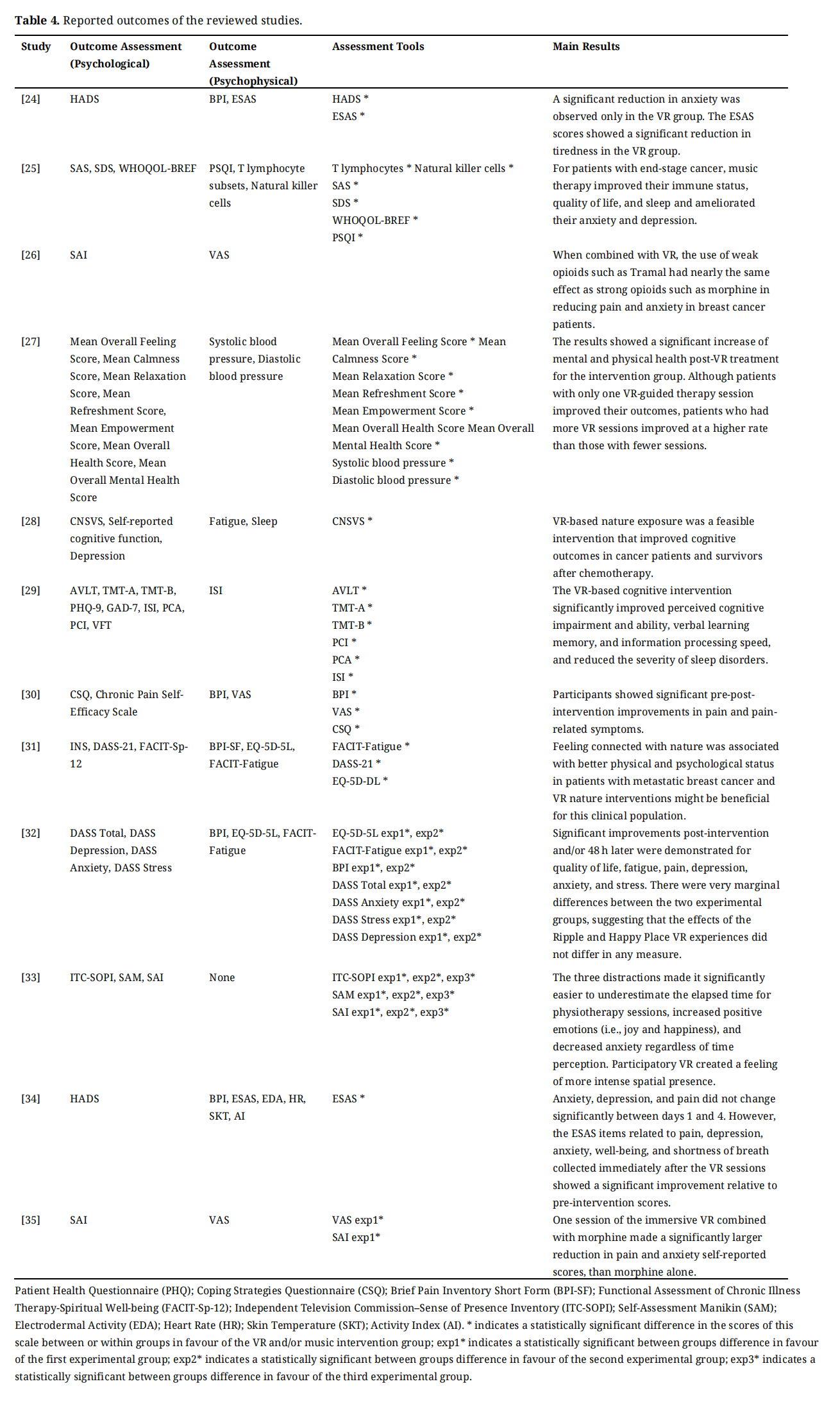 In Table 3, eleven studies [24,26–35] examined the effects of a VR intervention. With the exception of two studies [28,29] that did not specify the VR environment shown to participants, all of the studies used VR environments consisting of relaxing experiences of nature, such as underwater scenes, outdoor camping, beaches, waterfalls, and mountain ranges. One study [27] featured an outer space environment and also included scenes of the destruction of cancerous cells and, for religious participants, the Star of Bethlehem.