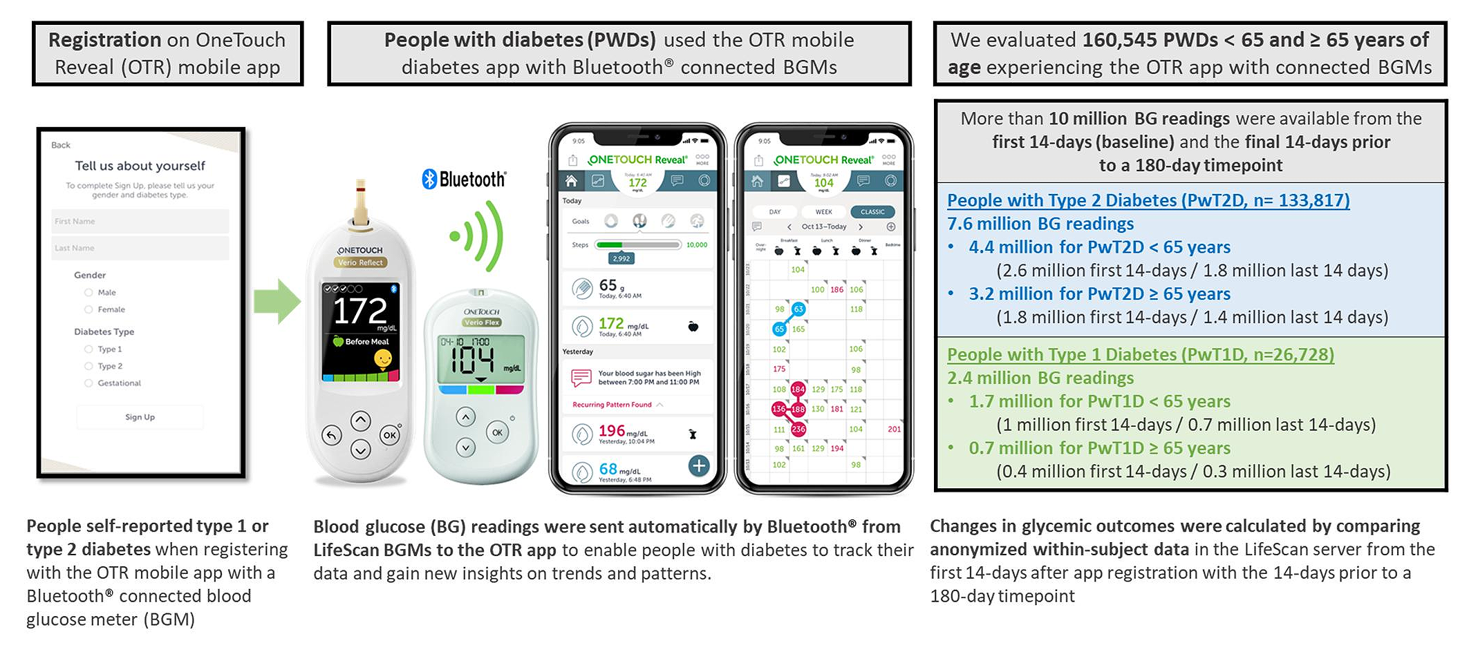 RWE, real-world evidence; OTR, OneTouch Reveal; OTVR, OneTouch Verio Reflect; OTVF, OneTouch Verio Flex; BGM, blood glucose meter; PWDs, people with diabetes; PwT2D; people with type 2 diabetes; PwT1D; people with type 1 diabetes; RIR, readings in range; RITR, readings in tight range; CGM, continuous glucose monitoring
