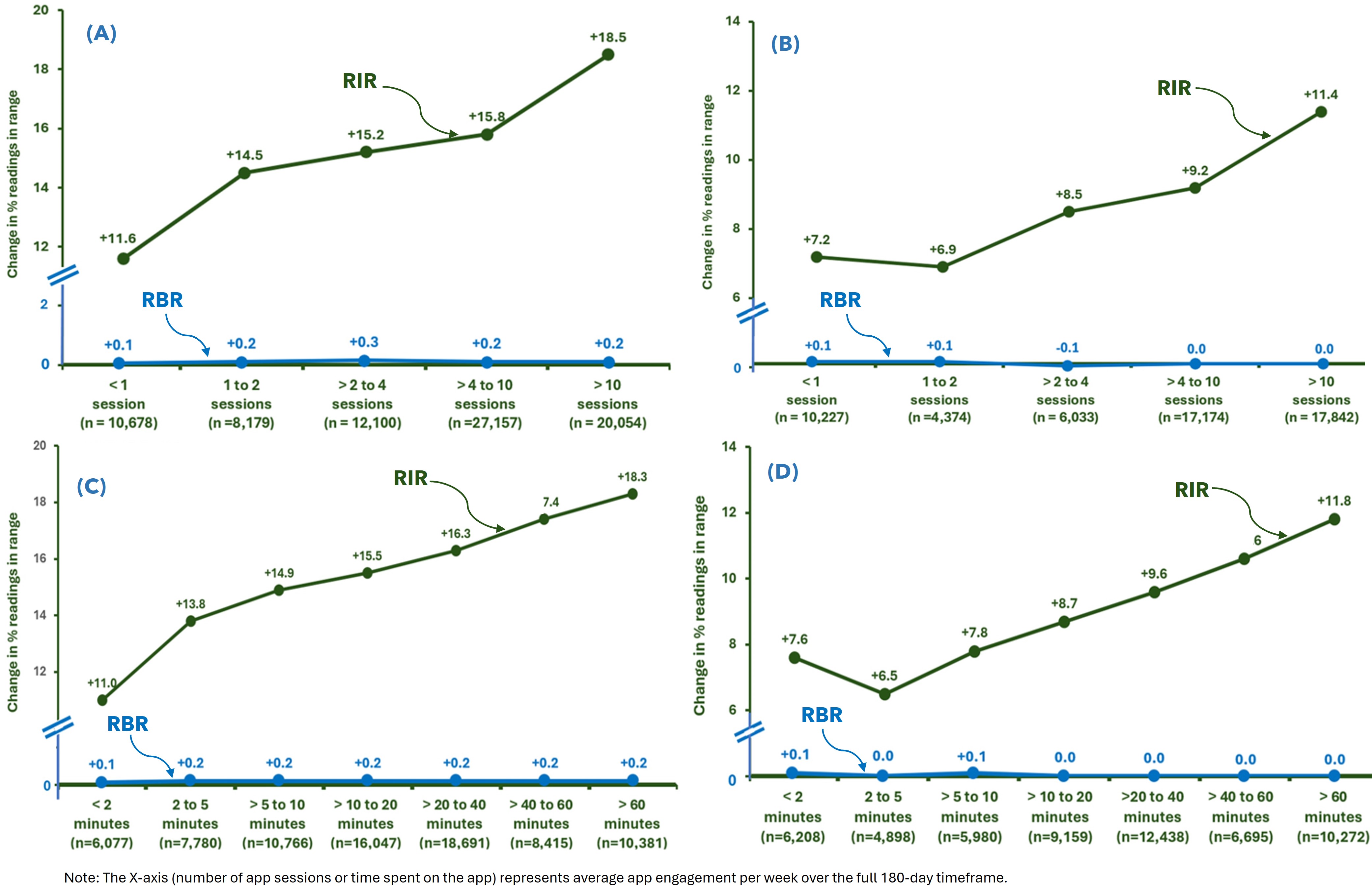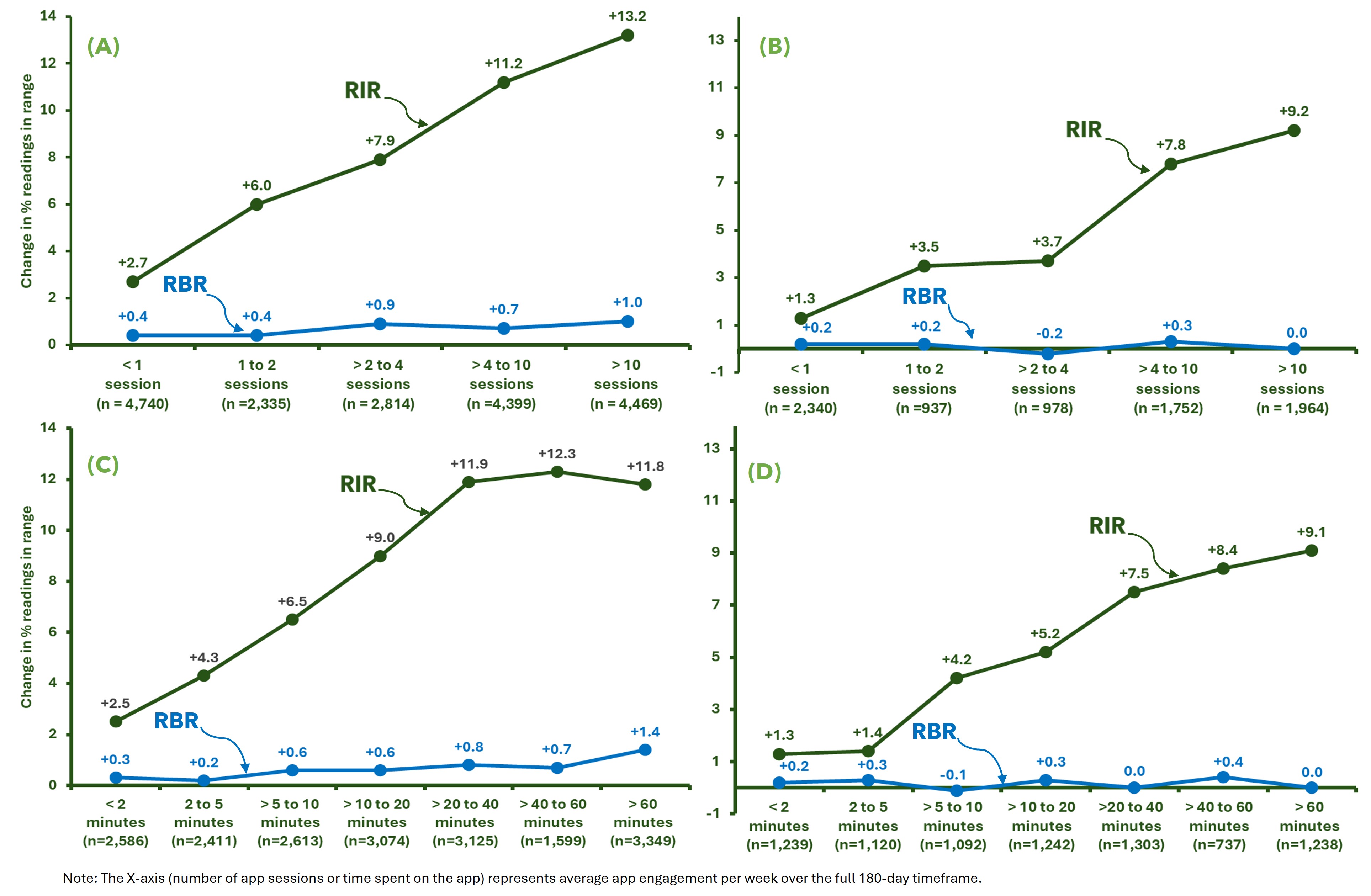 Additional analyses (See Supplementary File S1) provide more context on how people of different ages engaged with the app and how this influenced metrics other than RIR. The majority of PwT2D were highly engaged with the app, with 60.4% of those <65 years and 62.9% of those ≥65 years performing >4 app sessions per week on average over 180 days. In terms of time spent in app sessions, 48.0% of PwT2D < 65 years and 52.8% of those ≥65 years spent >20 minutes viewing app insights each week. Progressive improvements in mean BG mirrored trends of increasing app engagement in PwT2D. PwT2D <65 years who performed >2 to 4 app sessions per week lowered mean BG by −25.6 mg/dL from baseline at 180 days compared to a −13.2 mg/dL reduction from baseline for those ≥65 years of age. The change from baseline in the frequency of BG checking in each category of app engagement was similar in older and younger PwT2D. Similar trends and insights are reported for PwT1D, although, as stated previously, the magnitude of improvement in glycemic measures was lower for PwT1D than was observed for PwT2D.