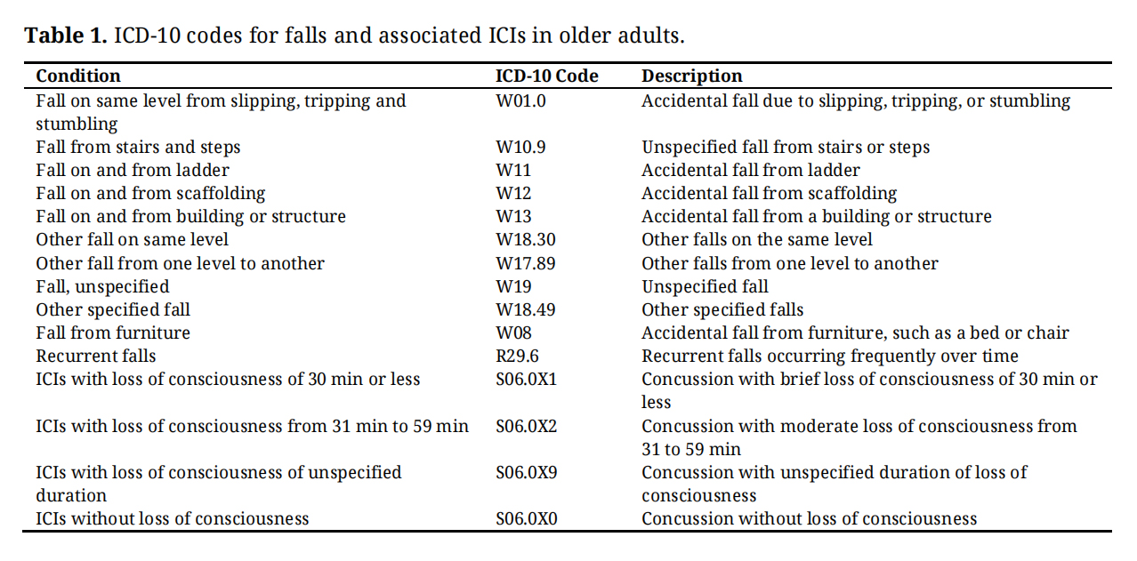 Patient SelectionPatients were categorized into two cohorts, those experiencing an initial fall and those with recurrent falls within one year. We included patients aged 65 to 89 who experienced at least one fall and had a documented ICI within the year 2023. Patients without an ICI diagnosis were excluded from the final analysis. Individuals were categorized into two cohorts: those who experienced an initial fall with an ICI, and those with recurrent falls within the same year who also sustained an ICI. Due to limitations in the TriNetX data structure, we could not capture the exact number or timing of multiple recurrent falls beyond the study window. Therefore, patients with multiple fall incidents during 2023 were collapsed into a single outcome per individual, based on whether a recurrence occurred during that year. Specifically, Cohort 1 comprised patients who experienced their initial fall, while Cohort 2 included those who had multiple fall incidents within the same timeframe. To ensure relevance to the study's aims, we further filtered the dataset to include only those patients who sustained ICIs within one year following either their initial fall or recurrent falls. For this study, ICIs were defined as a spectrum of head injuries resulting from external trauma, including cerebral hemorrhage, subarachnoid hematoma, concussion, traumatic brain injury, and ischemic lesions. While loss of consciousness was captured through specific ICD-10 codes, it was not the sole criterion for classification. The diagnostic criteria were based on the following ICD-10 codes related to falls and ICIs (Table 1).