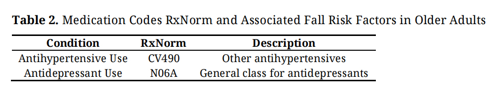 We utilized the RxNorm coding system to classify medication usage among older adults, specifically focusing on those medications associated with an increased risk of falls. We identified antihypertensive medications using the RxNorm code ‘CV490’ and antidepressants using the RxNorm code ‘N06A’ (Table 2).