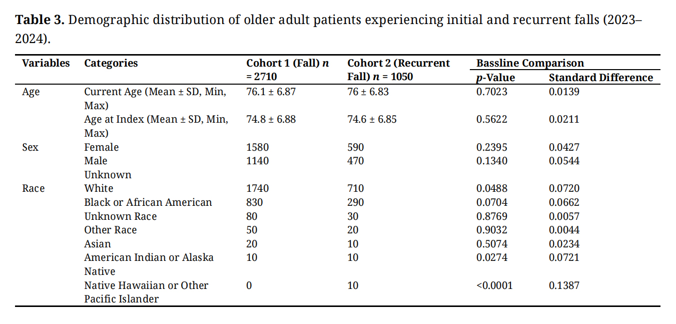 Statistical AnalysisThe statistical analysis was performed using the TriNetX platform. Descriptive statistics summarized the demographic characteristics of the study population, with continuous variables (such as age) presented as means and standard deviations, and categorical variables (such as sex, race, and ethnicity) shown as frequencies and percentages. Univariate analyses were conducted using Chi-square tests for categorical variables and t-tests for continuous variables to compare the two cohorts (initial and recurrent falls).