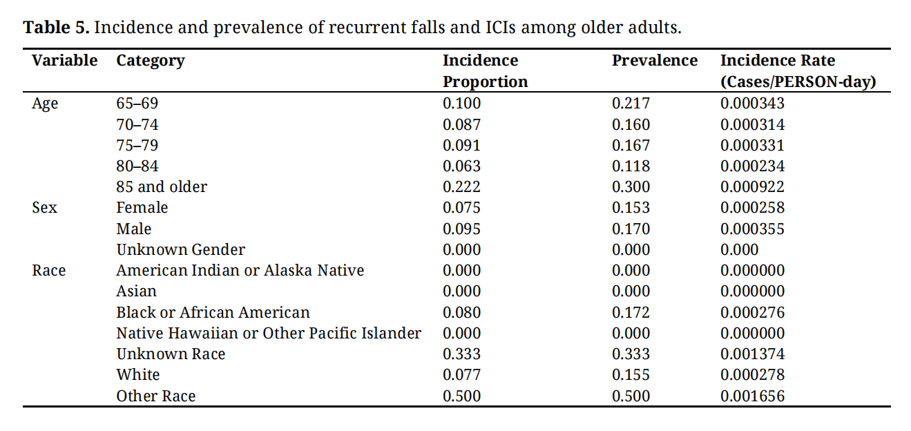 Table 5 offers a look at the incidence and prevalence of recurrent falls and the related ICIs among older adults. The data shows that those aged 85 and older face a significant challenge, with a high incidence proportion of 0.222 and a prevalence of 0.300. This highlights how vulnerable this age group is when it comes to recurrent falls. For younger groups, like those aged 65 to 69, the incidence proportion is lower at 0.100, but it's still a notable concern, with a prevalence of 0.217 (Figure 2).