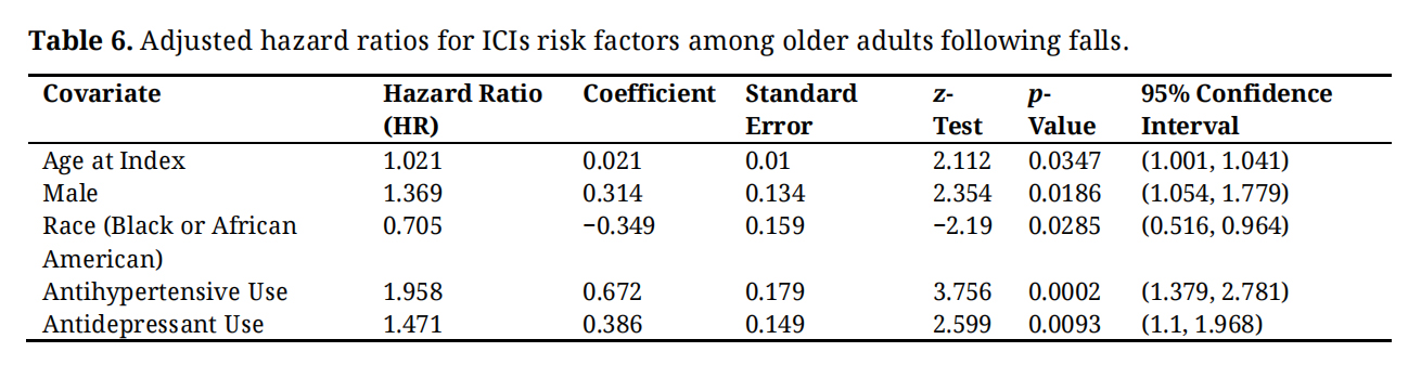Medication use, particularly antihypertensive and antidepressant medications, further influences the risk of ICIs and could serve as a confounding factor due to its impact on both fall risk and injury severity. Individuals taking antihypertensive medications demonstrated a higher risk of sustaining ICIs (HR = 1.958) compared to those not using these medications, suggesting a strong association between use and injury risk, meaning they are 95.8% more likely to sustain ICIs than those not using these medications. This association is highly significant (p = 0.0002), with a confidence interval of 1.379 to 2.781, indicating that antihypertensive use substantially increases injury risk. Similarly, antidepressant use is associated with a 47.1% higher risk of ICIs (HR = 1.471, p = 0.0093), with a confidence interval of 1.1 to 1.968. These results suggest that the effects of these medications on balance and coordination may contribute to a heightened likelihood of severe injury, further acting as confounders in the relationship between demographic factors and injury outcomes (Table 6).