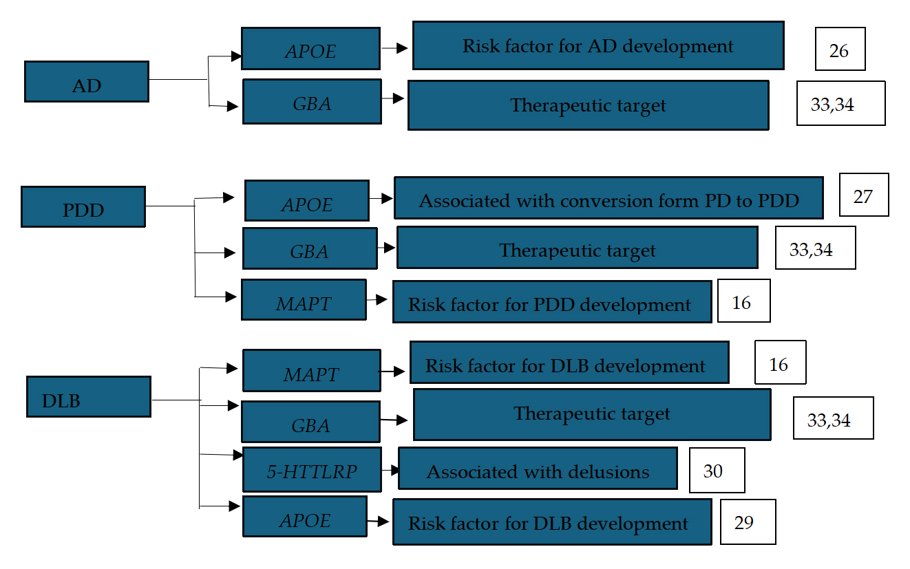 Genetic Basis of Neuropsychiatric Symptoms in AD, PDD and DLBStimulating evidence of a common genetic basis between PD and AD seems to come from a genome-wide meta-analysis by Real et al. (2023) who identified APOE-4 as a major risk factor both for AD and for the conversion from PD to PDD [26]. Accordingly, a recent study by Wu et al. (2024) confirmed the causative role of APOE-4 for the development of dementia, while SNCA-AS1 and LKKR2 seem to exert a protective role [27]. Regarding SNCB, it has been reported a high prevalence of genotypes associated with low gene expression [28]. In support of this evidence, Guerreiro and colleagues suggested that DLB and PD share lots of genetic determinants, the APOE locus [29]. Another shared genetic polymorphism is 5HTTLPR, a 43-base-pair insertion/deletion in the promoter region of the SLC6A4, with a short and long allele, often associated with delusions in DLB [30]. In this framework, a study carried out in individuals with DLB and PDD found that those with homozygosis for the L/L genotype and a lower Mini Mental State Examination (MMSE) score showed an increased risk for delusions, thus suggesting that the 5HTTLPR polymorphism is associated with delusions in DLB [30]. Accordingly, Quaranta et al. (2009) and Sweet and colleagues reported the L/L genotype to be associated with psychosis in AD and, in turn, suggested that the 5-HTTLPR polymorphism might be a shared risk factor for psychotic symptoms across diseases [31,32]. Other genes implicated in the pathophysiology of AD, PD, and DLB, are glucocerebrosidase gene (GBA) variants, the SNPs, which could be useful target therapeutic interventions [33,34], and the microtubule-associated protein tau gene (MAPT), that may be associated with the risk of DLB and PDD [16]. When analysing DNA methylation patterns among different neuropsychiatric disorders, Fisher et al. (2023) pointed out that DLB and PD differed in the level of methylation in 197 regions with PD being associated with hypomethylation [35]. However, it should be considered that there have been conflicting results on the association between this polymorphism with a variety of neuropsychiatric symptoms and syndromes, also giving the fact that many of these studies are too small [36] (See Figure 2).