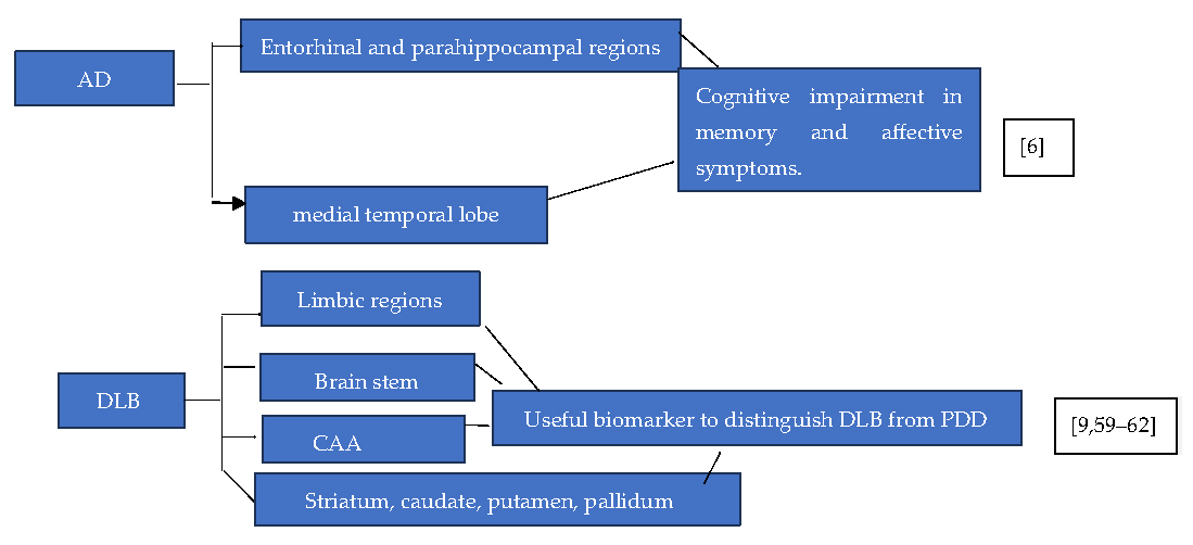 About functional and neurophysiological mechanisms, WMA seem to be typical of both AD and DLB [71]. In terms of differences, MCI-LB individuals showed a posterior cerebral hypometabolism and hypoperfusion, while EEG slowing together with delusions and hallucinations are frequently found in DLB [65]. Meanwhile, PET hypometabolism in temporal, frontal and parietal regions was also related to AD [70]. Renewed interest about neuroimaging correlates of AD, PDD, and DLB has recently grown, as shown by the several trials active to find out PET imaging tracers for neuroinflammation [90].