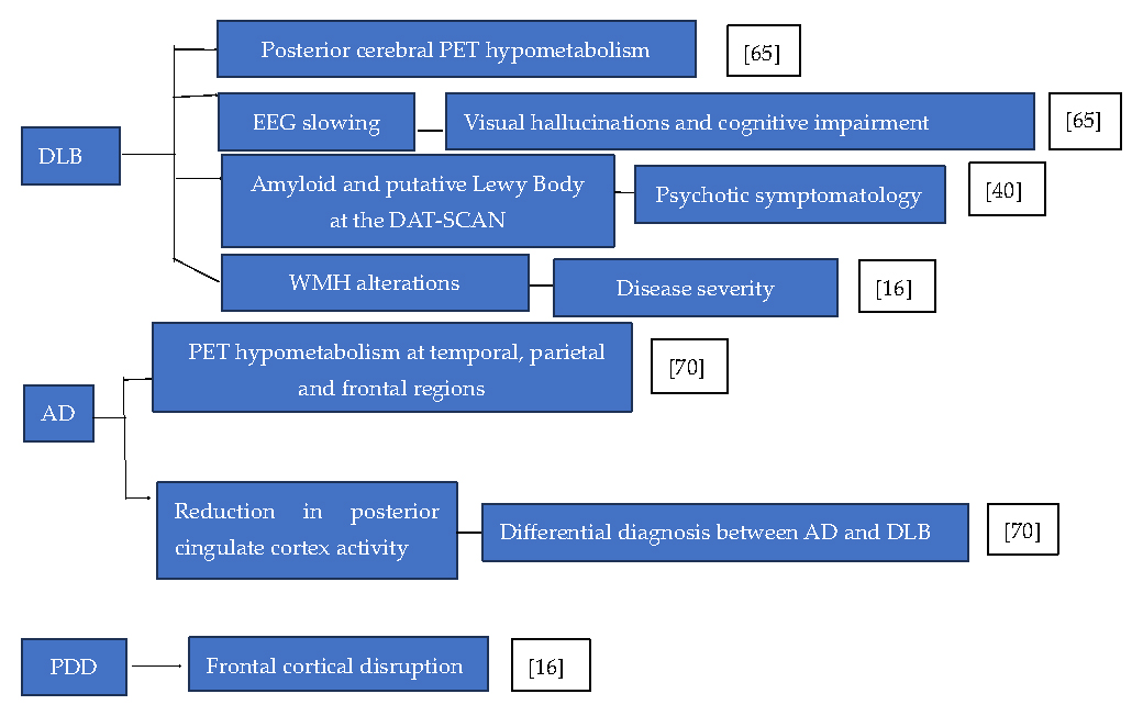 About instrumental exams, a recent meta-analysis focused on mild cognitive impairment diagnosis in Lewy Body Disease (MCI-LB) showed that electroencephalogram (EEG) and fluorodeoxyglucose PET may be important tools for this clinical situation [65]. Specifically, PDD individuals presented abnormalities in EEG [66]. Furthermore, for MCI-LB patients, PET reported a posterior cerebral hypometabolism and hypoperfusion when compared with Mild cognitive impairment in Alzheimer Disease (MCI-AD) and controls, while EEG slowing was associated with visual hallucinations and poorer cognitive performance in MCI-LB [65]. Thanks to amyloid positron emission tomography and dopamine transporter single photon emission computed tomography (DAT-SPECT) analysis, it has been pointed out that the presence of amyloid and putative Lewy Body pathologies was associated with psychotic symptomatology [40]. It should also be considered that both DLB and PDD present similar metabolic patterns of reduced metabolism in parietal, frontal, anterior cingulate, and occipital regions if compared to healthy controls [67,68]. Moreover, DLB metabolic pattern underlying cognitive impairment, even though not detrimental for general survival, seems to be like that of AD [69]. Besides, metabolism in the posterior cingulate gyrus is particularly useful to make a differential diagnosis between DLB and AD. In fact, DLB is associated with hypermetabolism in the posterior cingulate if compared to the precuneus and cuneus. From the other side, hypometabolism in AD mainly affects temporal, parietal and frontal regions [70]. Intriguingly, functional impairment in motor-related regions, as shown by regional homogeneity (ReHo) studies, suggests that there exists a Lewy body disease spectrum of alterations. ReHo differences among the diseases, such as the default mode networks (DMN) and sensory-motor resting state networks, could be at the basis of aetiological divergences between AD and DLB [64]. DMN studies, in fact, revealed that, compared to PD and DLB subjects, AD patients present a significant reduction in the posterior cingulate cortex activity. Meanwhile, DLB and PDD are characterized by impairment in the posterior brain regions, namely the occipital, parietal, and precuneal cortices [71]. To be accurate, it could be stated that while PDD is associated with frontal cortical disruption, DLB is characterized by parietal and occipital impairment [16]. Regarding sensory motor network abnormalities, functional connectivity alterations of the basal ganglia and cortical motor regions have been reported in DLB [3]. By combining another functional measure, the SN, with the central executive network (CEN) it could be found that are more common in DLB than in AD [16]. Another useful functional tool to detect dementia affecting older individuals is white matter hyperintensity (WMH), usually associated with cortical thinning and cerebral atrophy [72]. WMH alteration pattern seems to be more severe in DLB and AD than in PD dementia. Hyperintensity is more severe in the temporal lobe in DLB than in PD dementia [16] (See Figure 5).