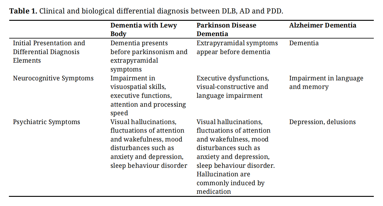 In terms of similarities, the above-mentioned diseases have some shared points: both DLB and PDD show executive dysfunctions, visual-constructive and language impairment, mood disturbances such as anxiety and depression, sleep behaviour disorder and a particular sensitivity to neuroleptics [16].