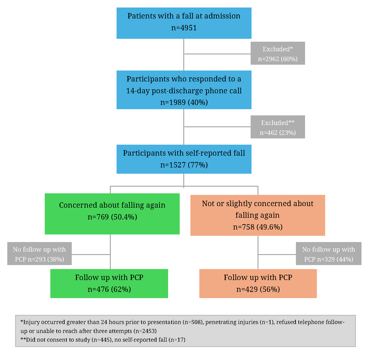 Methods: This was a secondary analysis of a large prospective study which included patients aged ≥65 years who had sustained head trauma from a fall. Patients with penetrating injuries, injury >24 h prior to presentation, and transfer from another hospital were excluded. Participants were telephonically followed up 14 days after ED presentation. They were asked about their concern for a repeat fall and whether they had followed-up with their PCP since discharge.