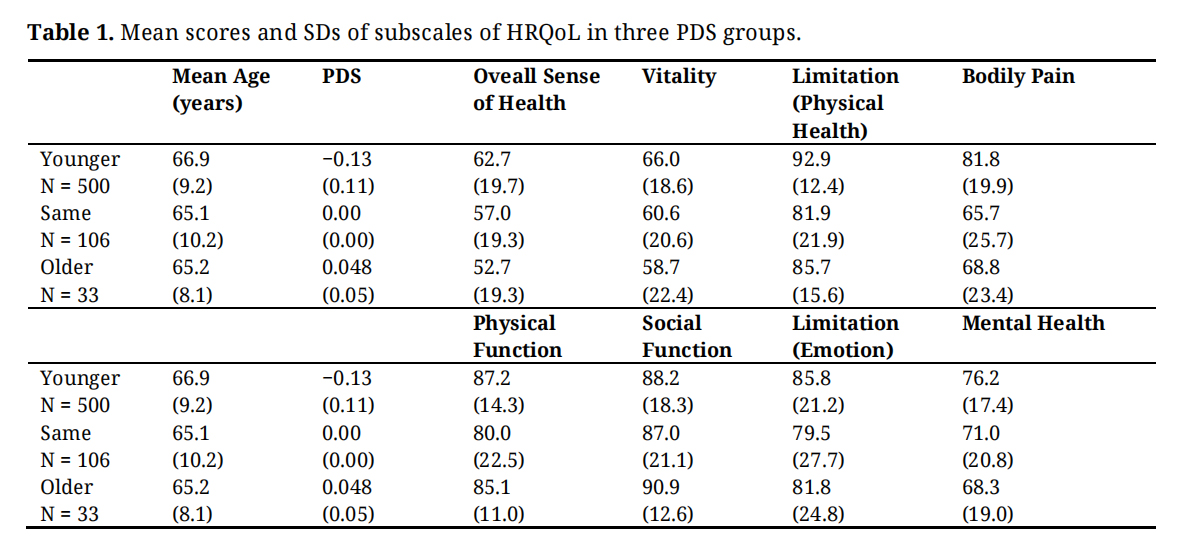 Table 1. Mean scores and SDs of subscales of HRQoL in three PDS groups.