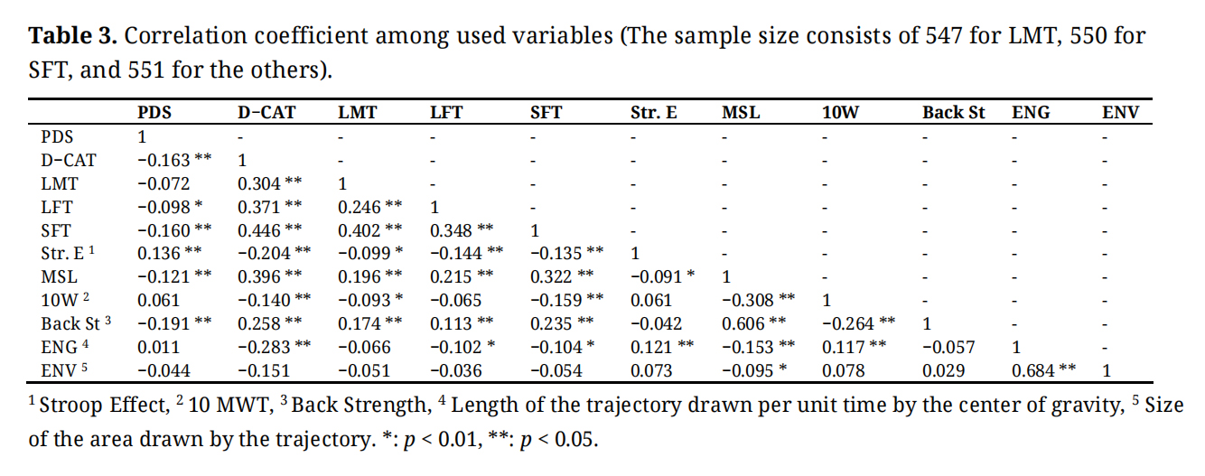 As mentioned earlier, the number and quality of variables incorporated in a multivariate regression analysis are important because they significantly affect the results of the analysis. In this study, we decided to proceed with the analysis by adopting five cognition-related variables and five physical motor-related variables, considering the theoretical background. For this purpose, we incorporated the D-CAT, LMT, LFT, SFT, and Stroop effect size variables into the neuropsychology team examination. The MSL, 10MWT, ENG, ENV, and back strength scores were obtained from the orthopedics team data.