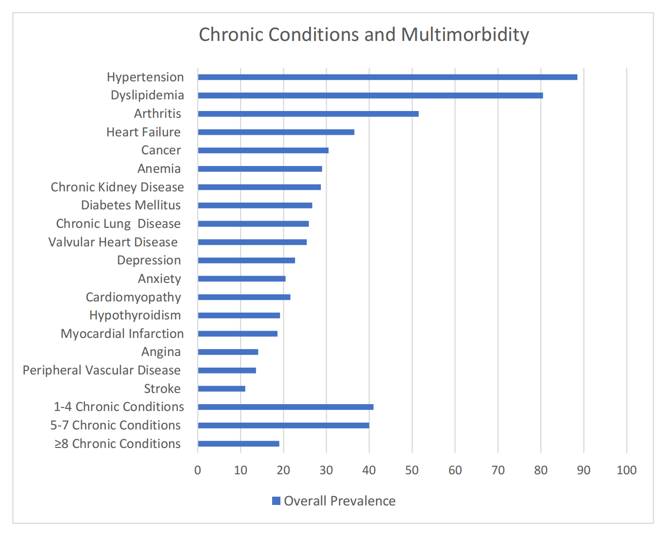 The most prevalent chronic conditions included hypertension (88%), dyslipidemia (80%), and arthritis (51%). Overall, 41%, 40%, and 19% had 1–4, 5–7, and 8 or more chronic conditions respectively (Figure 1).
