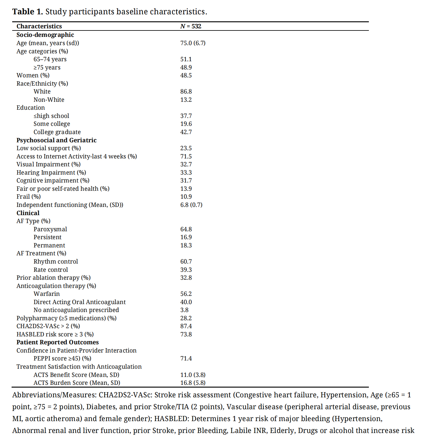 Participants in the analytic sample (n = 532) were younger (p = 0.02), more likely to be men (p = 0.03), independent of their IADLs (p < 0.001), less likely to be cognitively impaired (p < 0.01) or to be frail (p = 0.03), compared to those excluded (n = 712). Of the included participants (mean age: 75 years, 48% women, 87% White), one-quarter reported low social support, three-quarters had internet access in the preceding four weeks, one-third had visual, hearing, and cognitive impairment. One in ten participants were frail (Table 1). Two-thirds were diagnosed with paroxysmal AF and were on rhythm control. One-half of study participants were on warfarin and 40% were on DOACs. Most participants reported being very/extremely confident in their patient-provider interaction (Table 1).