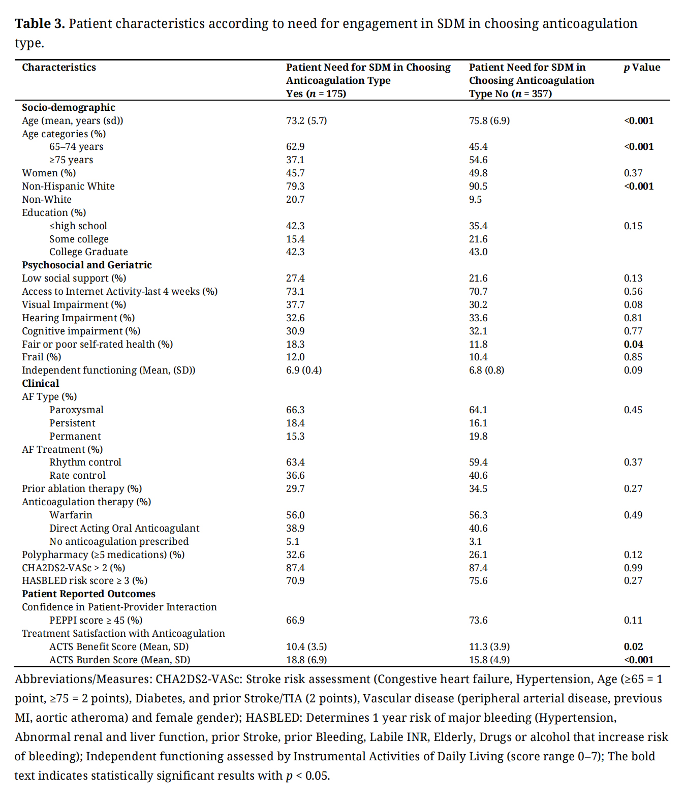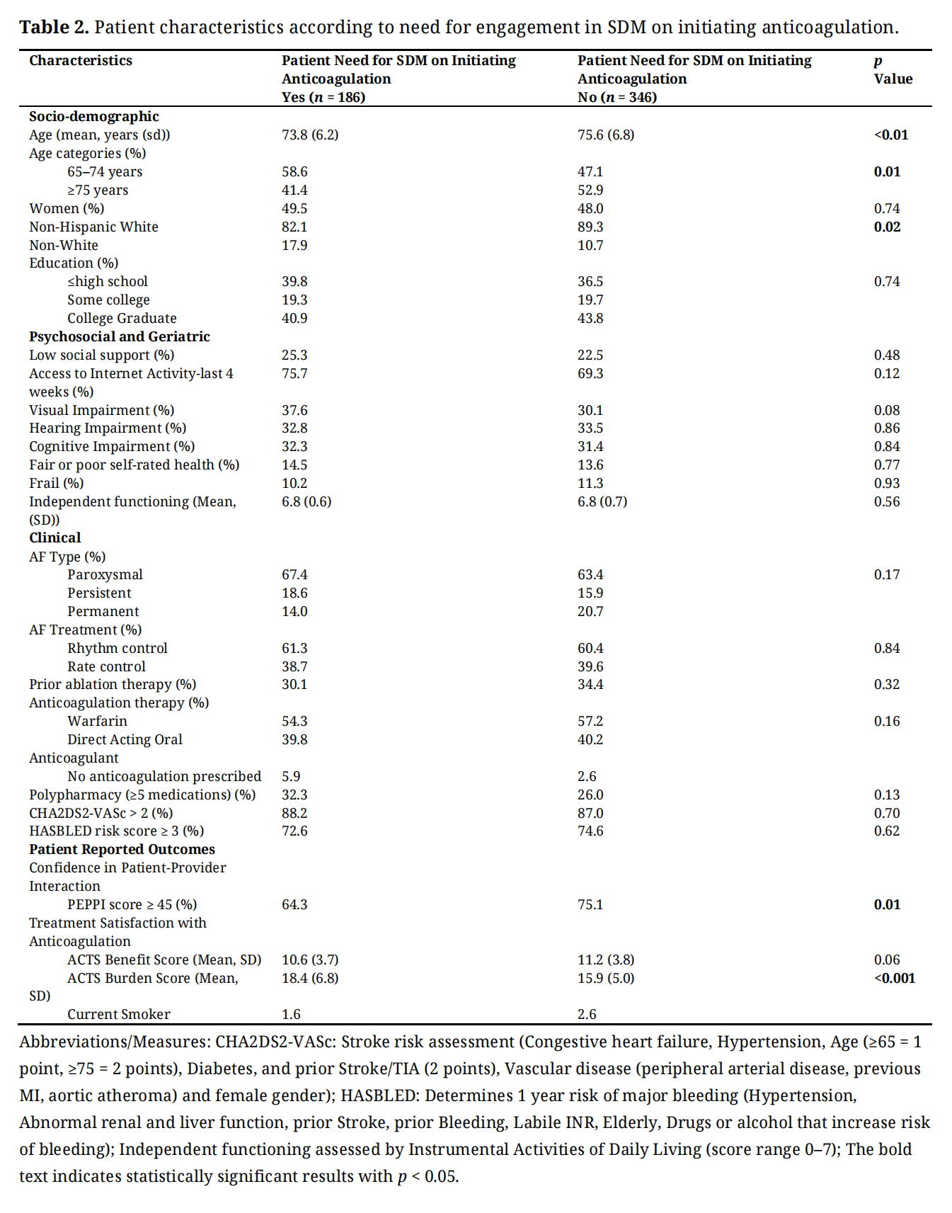 Table 3. Patient characteristics according to need for engagement in SDM in choosing anticoagulation type.