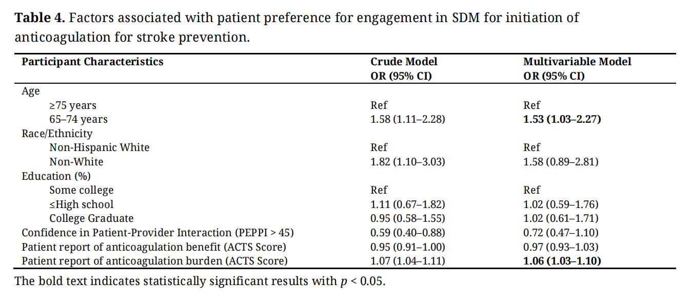Table 4. Factors associated with patient preference for engagement in SDM for initiation of anticoagulation for stroke prevention.