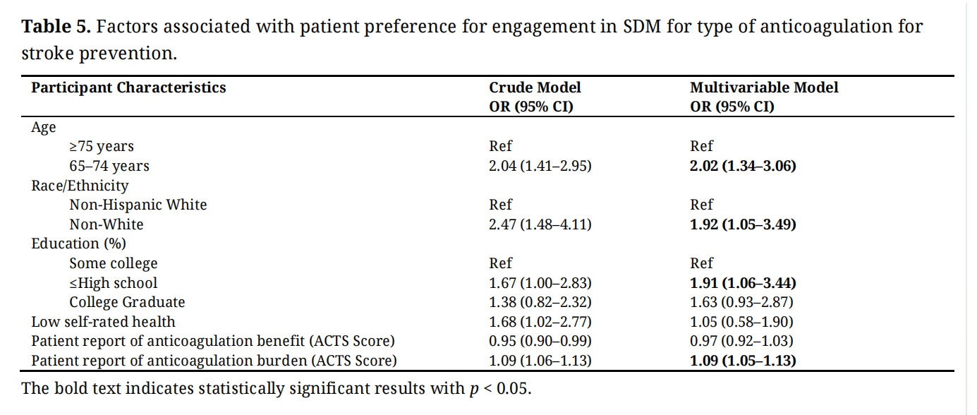 Table 5. Factors associated with patient preference for engagement in SDM for type of anticoagulation for stroke prevention.