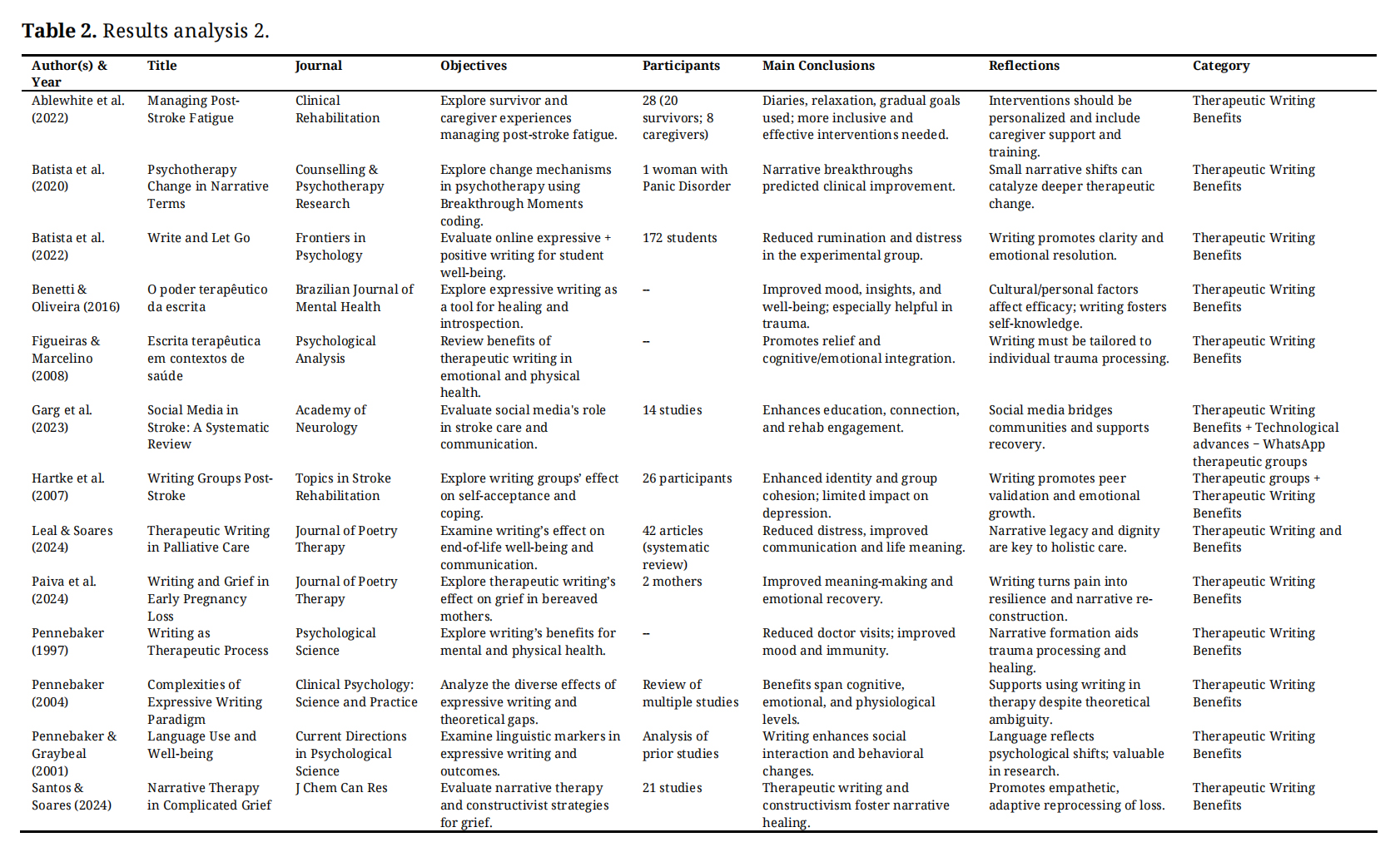 The findings from the included studies were synthesized using an arrative and thematic approach, rather than relying solely on tabular presentation. Studies were grouped according to key outcomes, such as social support and well-being, and according to the type of intervention (e.g., therapeutic writing, group therapy, digital interventions).