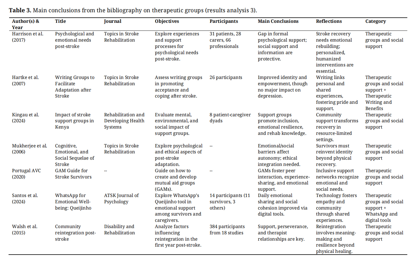 Stroke is one of the leading causes of death worldwide, with consequences that impact physical, mental and emotional health, and social life of survivors. Social support is fundamental to promote rehabilitation and quality of life of stroke survivors. Objective: investigate the impact of therapeutic groups in promoting social support and well-being among stroke survivors, as well as to understand how therapeutic writing, mediated by WhatsApp, can contribute to strengthening group dynamics. Methods: a systematic literature review in different databases, on B-on, Pubmed, and Google Scholar. Results: therapeutic groups are crucial in improving quality of life and providing emotional support, self-reflection, and interpersonal relationships. Digital technologies, such as WhatsApp, are effective in facilitating communication and mitigating social isolation, benefiting survivors and their caregivers. At the same time, Therapeutic Writing has proven to be a valuable strategy for emotional expression, contributing to resilience and intragroup cohesion. Conclusion: Integrating digital technologies in rehabilitation is promising, offering new possibilities for inclusive and effective interventions. Innovative and multidisciplinary approaches that use accessible technologies and maximize the support and well-being of stroke survivors and caregivers are one of the avenues for future research.