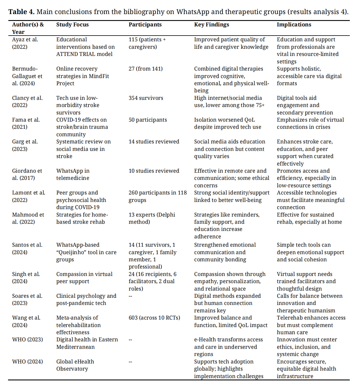 This systematic review explores how therapeutic groups promote social support and well-being among stroke survivors, emphasizing the role of therapeutic writing and WhatsApp. WhatsApp’s real-time interaction can strengthen group communication and offer consistent support. The study examines not only the emotional and social benefits of group therapy but also how mobile technologies enhance group cohesion and survivor well-being.