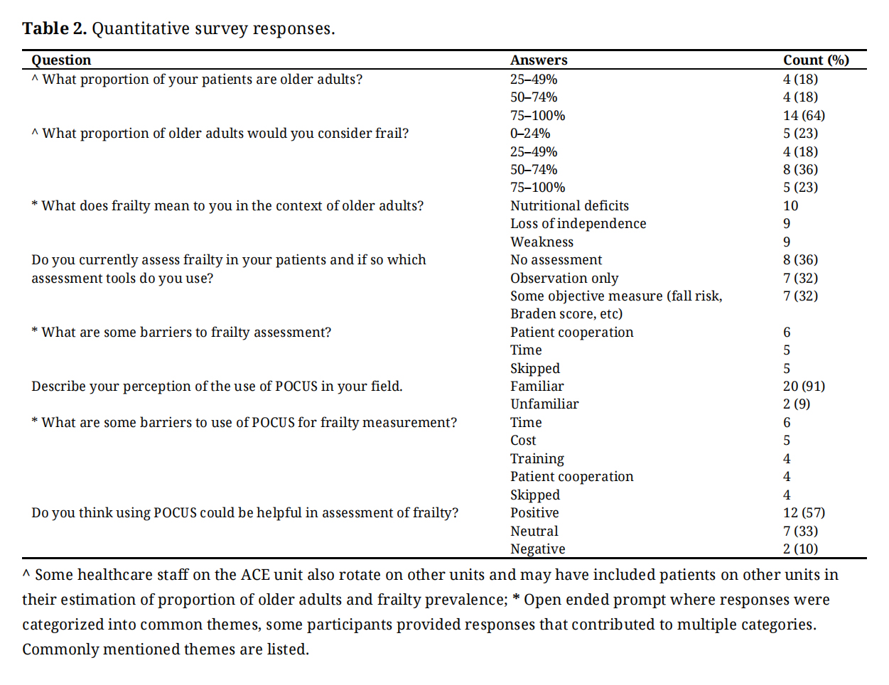 To explore current perspectives on using POCUS in frailty assessment as well as frailty assessment practices, we conducted semi-structured interviews with 22 interdisciplinary staff in a specialized geriatrics unit. Responses were coded and analyzed to inductively determine common themes.