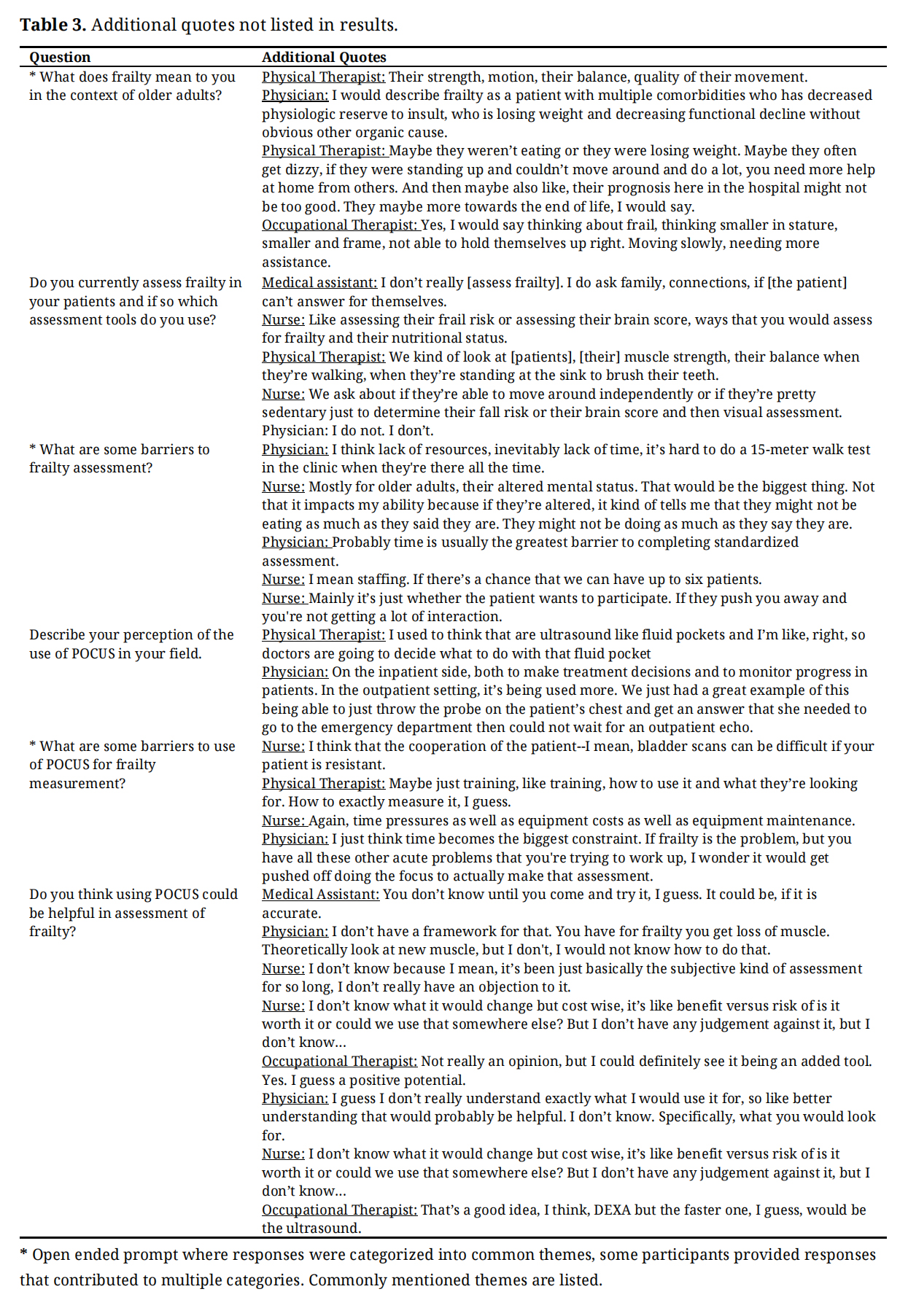 Frailty definitions and assessment methods varied widely across and within disciplines. Patient cooperation and time were perceived as main barriers to frailty assessment. Objective measures were not employed by most participants. Most participants were familiar with POCUS and thought it could be helpful to assess frailty. Reported potential barriers to implementation included time, cost, training, and patient cooperation.
