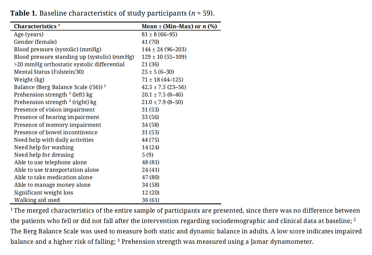 Of the remaining 59 participants who completed the entire 6-month follow-up: Two (2) died, and 13 dropped out for various reasons (cognitive deficits that became too severe, admission to a nursing home, or no interest in participating anymore). A CONSORT Flowchart figure is provided in Appendix A. At baseline, there was no significant difference in sociodemographic and clinical data between the patients who fell and those who did not after the intervention (Table 1).